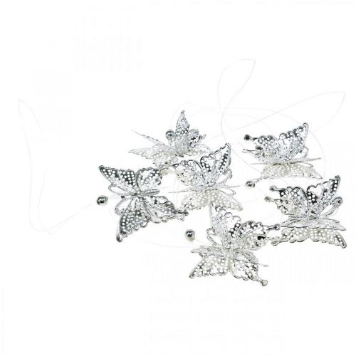 The decorative butterflies are filigree made of shiny silver sheet metal. The decorative pendants are characterized by very fine and clean embossed edges and patterns on the wings. Equipped with a long nylon thread for hanging, the pretty metal butterflies can be placed on branches in a vase or on a hanging decoration. - Through the transparent thread it looks like the butterflies are gliding weightlessly through the air.
