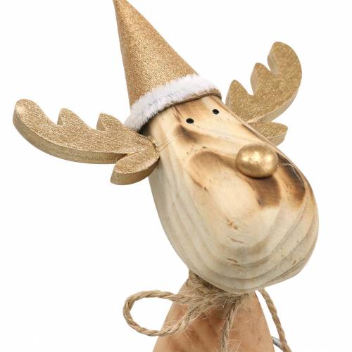 The wooden reindeer has a golden nose and golden antlers. She wears a gold Christmas hat on her head and a golden, glittering Christmas tree in her hands.