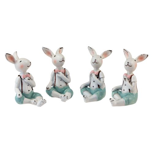 You will receive 4 bunny boys in a sitting position. All decorative bunnies have a paw casually placed on their knee. The difference lies in their gaze. While two look straight ahead, the other two's heads are turned slightly to the side. With their other paw, the boys grab their pink bow ties - or maybe their hearts?