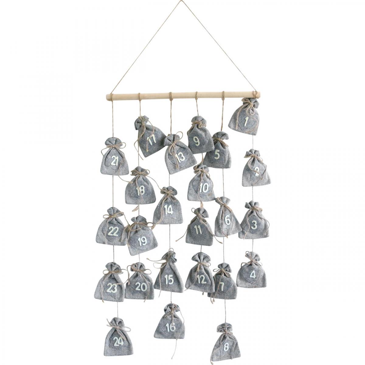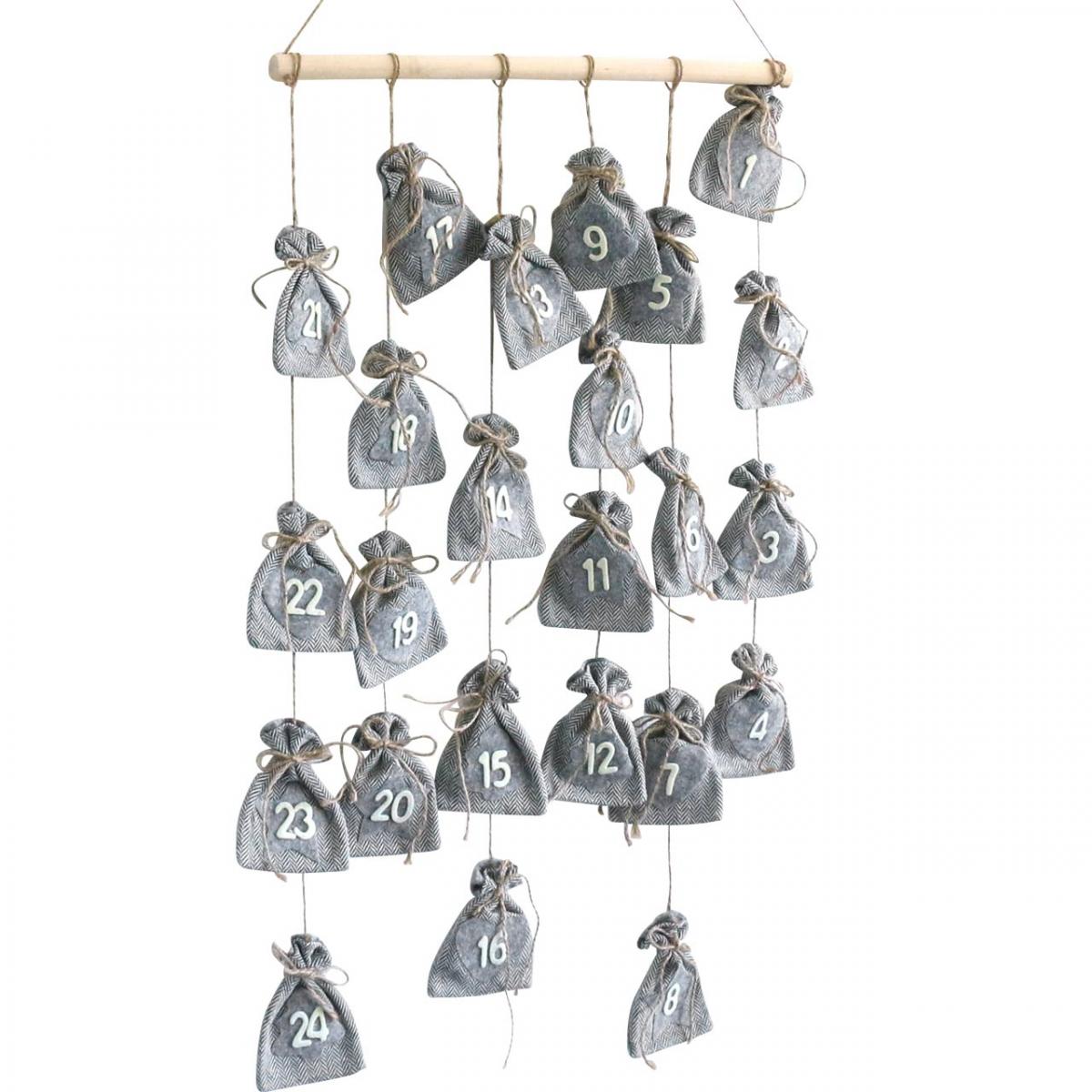 On a round wooden stick, 24 small bags made of fabric hang on six jute cords. The bags are made of fabric with a white-grey zigzag pattern on the front and felt on the back. A gray felt heart with a number from 1 to 24 is also attached to the front of each bag. And when the last bag in the Christmas calendar is open, it's already Christmas Eve. Two jute cords are attached to each bag so that you can tie them with a bow.