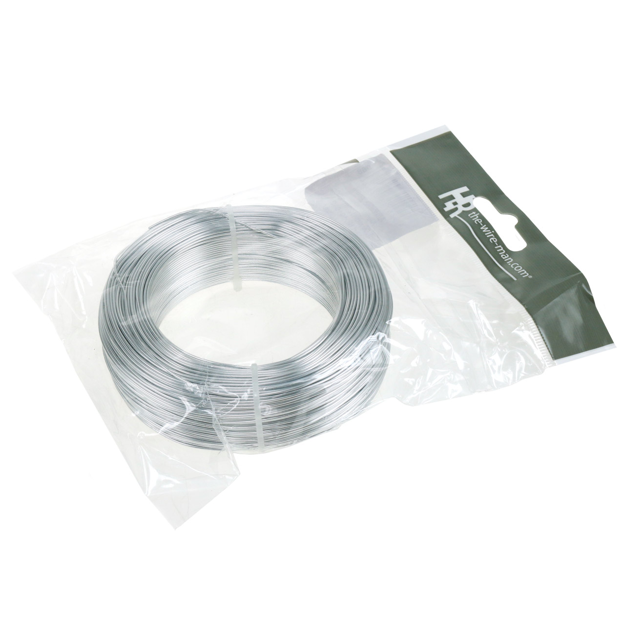 The silver aluminum wire comes to a length of about 120 meters and is tied together in a ring. So you can easily unwind it and cut off the amount you need. The wire has an approximate diameter of around 1 millimeter and is supplied in a plastic bag. The weight here is around 250 grams.
