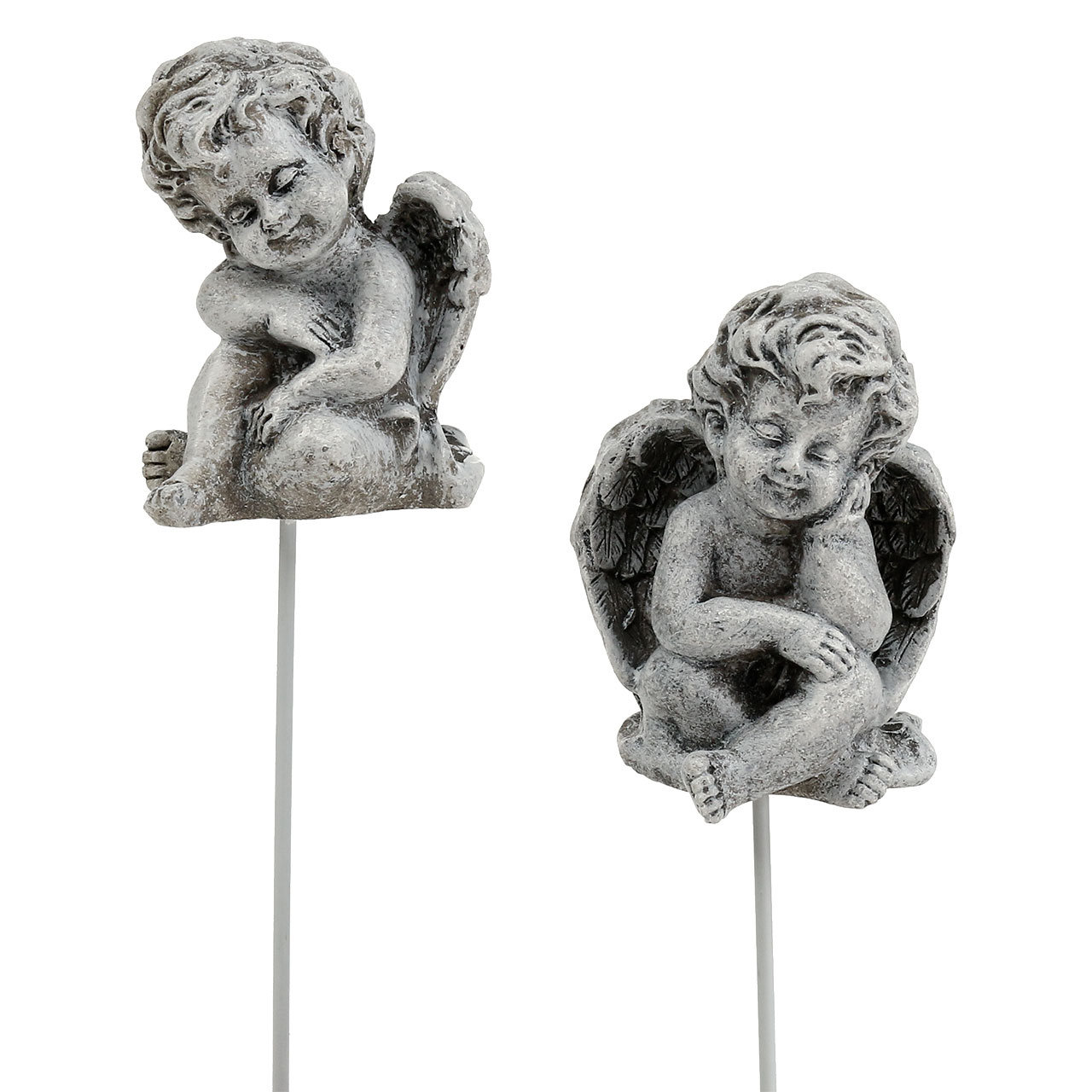 The small sitting angels in gray can be used in many different ways in floristic workpieces. Both angels have closed their eyes, their facial expressions are friendly. One angel sits cross-legged and has his head on his arm, the second has one leg up and leans his head on it.