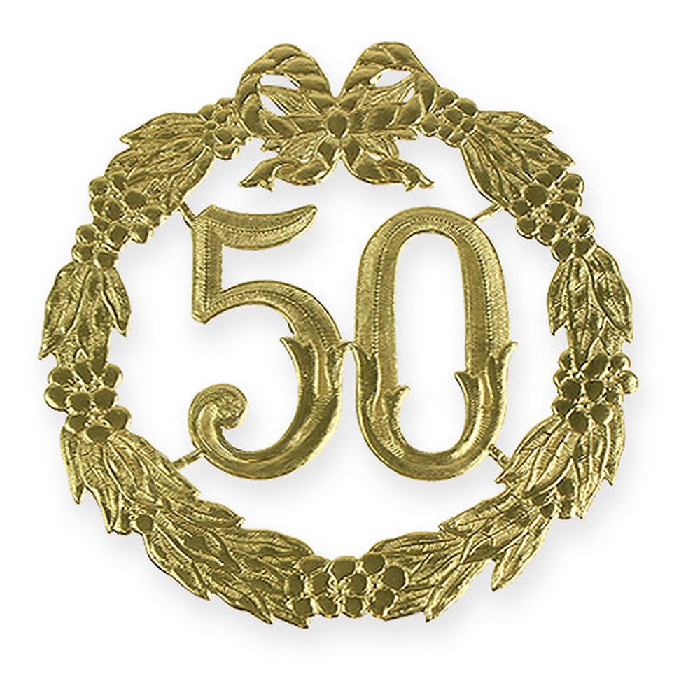 The golden anniversary number “50” was made from high-quality embossed cardboard and has a diameter of around 24 centimeters. Also decorate a club or company anniversary or your 50th birthday party with this versatile decoration number.