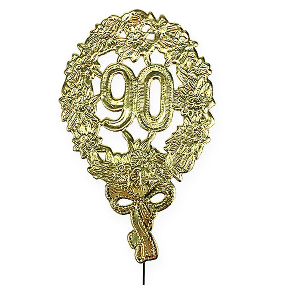 The anniversary number “90” can be integrated into all kinds of floristic decorations and measures approximately 8 by 12 centimeters. The number itself is roughly 3.3 by 3.5 centimeters. The entire decorative plug for the anniversary, including the pintle, has a total length of around 28 centimeters. The decoration number is delivered in gold in a pack of 10.