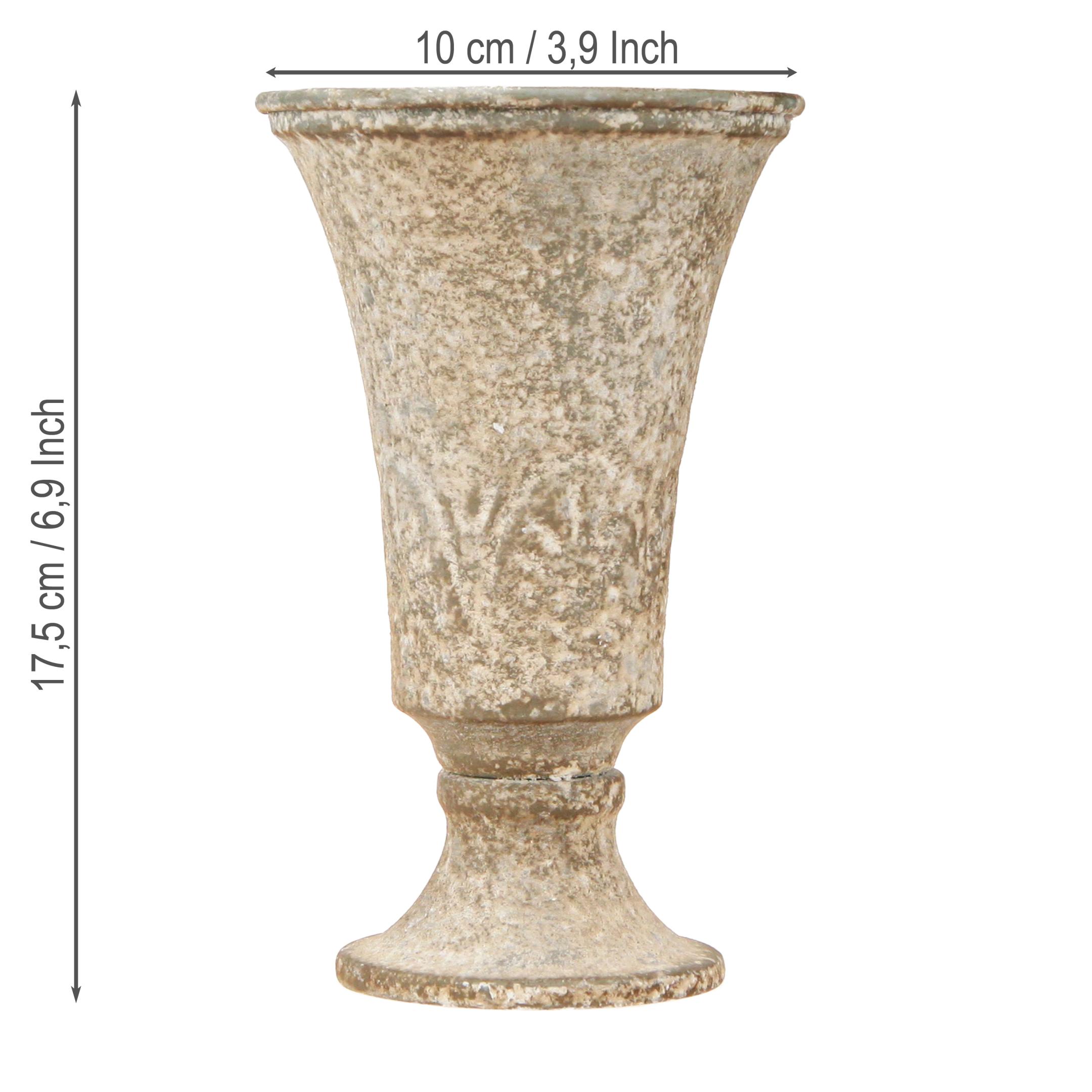 Discover the charming world of decorative trophies with our exclusive metal goblet in an antique design. This graceful metal goblet impresses with its rustic surface in white-brown-gray with artistic signs of age that give it an authentic vintage aesthetic. With a diameter of around 11 cm and a height of around 17.5 cm, the goblet is ideal as a functional eye-catcher in any living environment. The conical shape, tapering towards the base, allows both lush flower arrangements and stylish dry arrangements to be perfectly showcased. Use this decorative item as a vase and flowerpot for planting and benefit from the planting depth of around 10 cm to 5 cm, which keeps your creations safe.