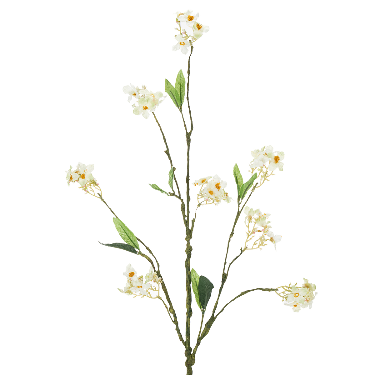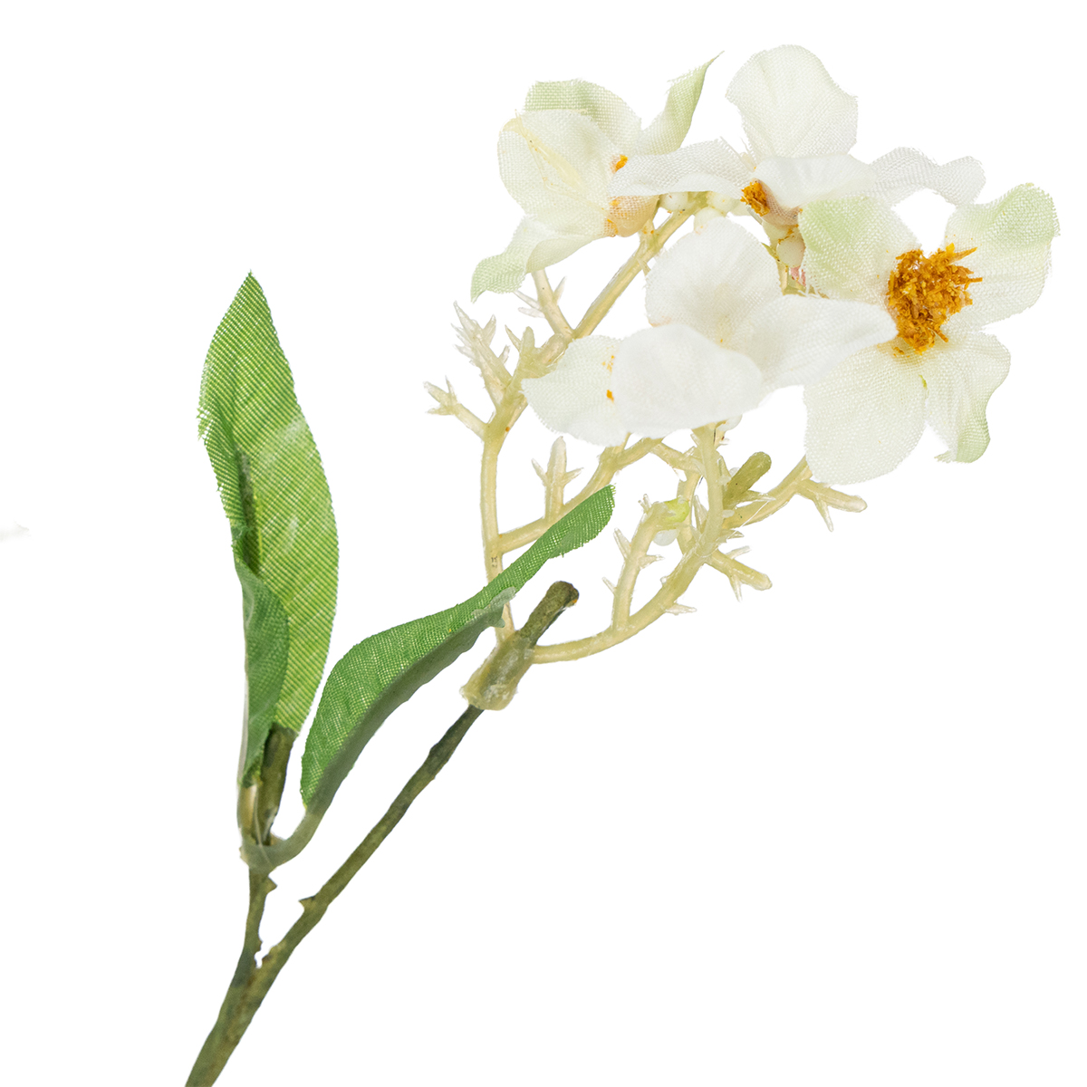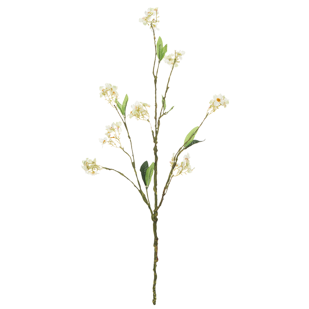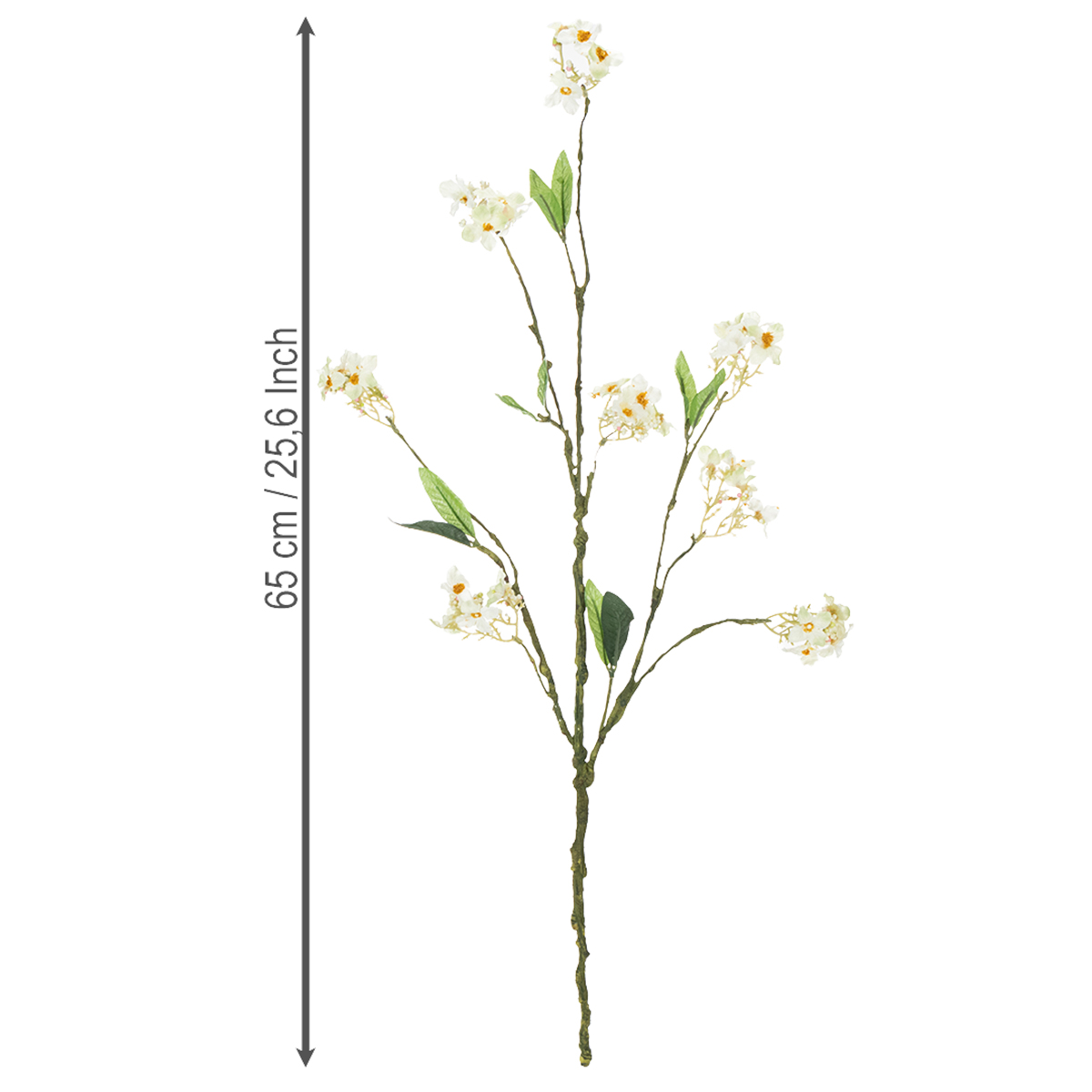 The flowering branch is approximately 65 centimeters long and branches off its green main stem into various large and small branches. The stem and small branches are made of plastic and have a slightly ossified appearance, as they contain many small bumps and strands, just like their natural counterparts. The small, white, open flowers still have yellow pollen clusters in the center and small pearls that represent closed blossoms, almost making you look forward to a beautiful, bountiful apple harvest.