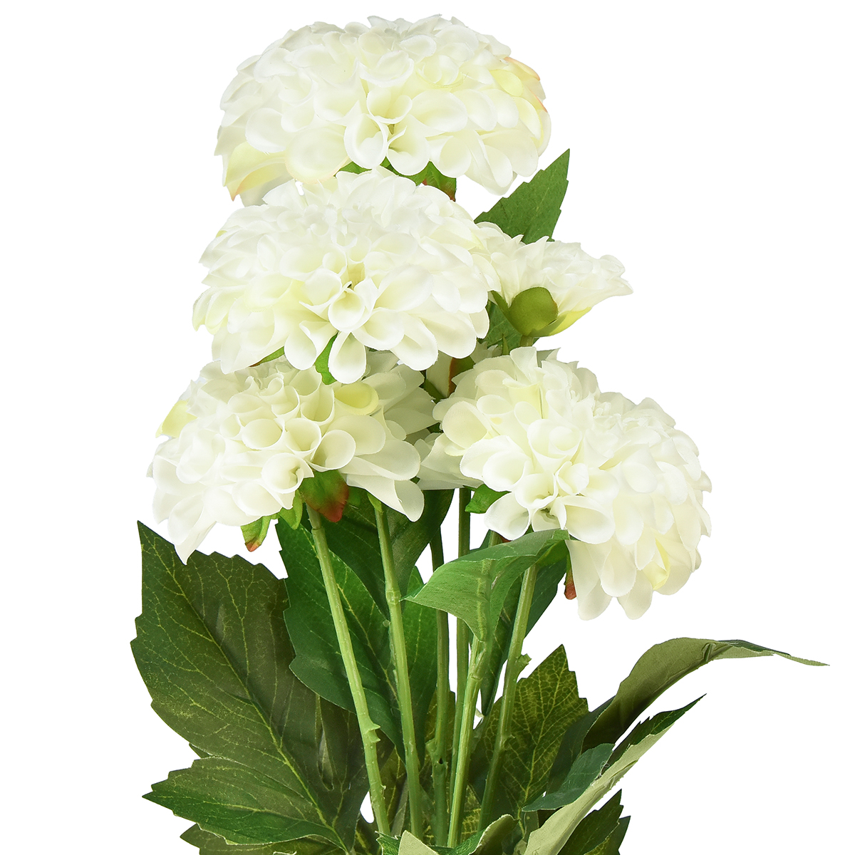 The artificial dahlias with bulbous, full flowers come as an artificial flower pick. The artificial plant decoration is divided at the top into two large and medium-sized white dahlia flowers and is filled with green, natural foliage.