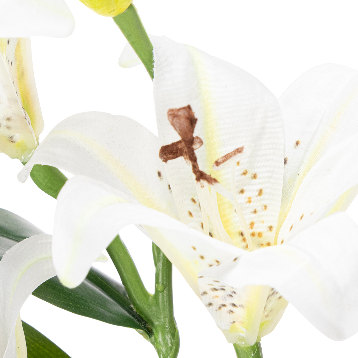 These high-quality artificial lilies impress with their realistic design and subtle charm. They are perfect for accentuating minimalist living rooms, but also look stunning in a romantic country-style setting. At 66 cm tall, the flowers can be incorporated into vases as well as larger arrangements. The polyester and plastic material ensures a natural look and a pleasant feel.