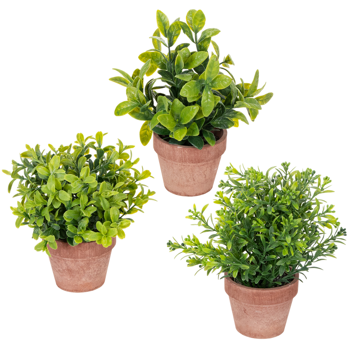 Three different high-quality artificial plants in pots