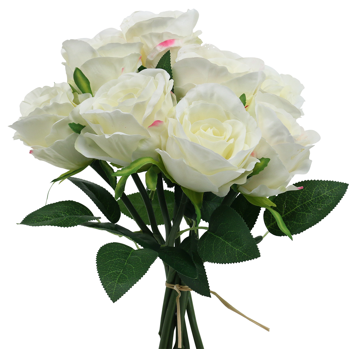 White roses, like these in the bunch, have a unique look and can be combined particularly beautifully with red roses. And this flower decoration will last forever because these are actually artificial roses!The flowers of the artificial flowers are made of fabric, a long plastic stem with typical leafy green comes with metal wire inside. – This means that the artificial flower decoration can be wonderfully displayed as a bouquet of roses in a vase or bent individually for arrangements, wreaths or decorative loops.