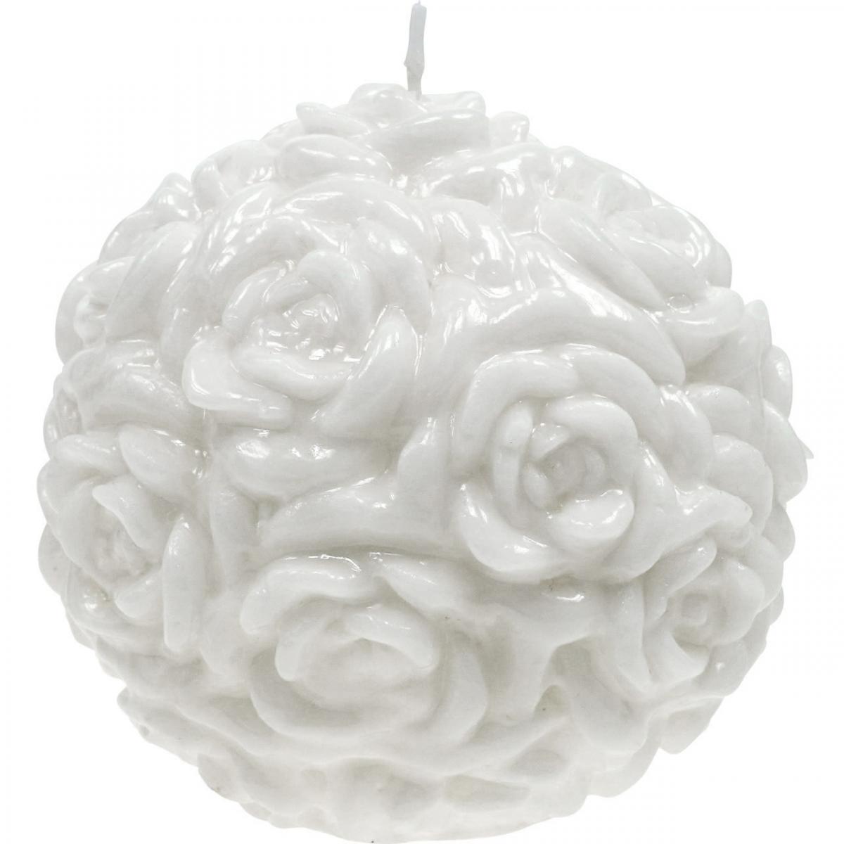 Ball candle with rose motif, table decoration for weddings and birthdays, 10.5cm, white