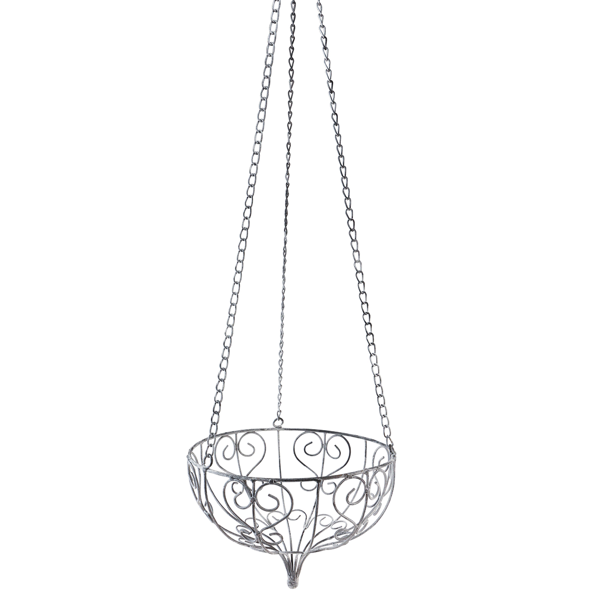 The metal basket has the shape of a bowl that comes together at the bottom to form a round tip like an antique decoration. The metal basket is stabilized on three chains. At the top, a hook ties the chains together, which you can then use to hang the metal basket from the ceiling.