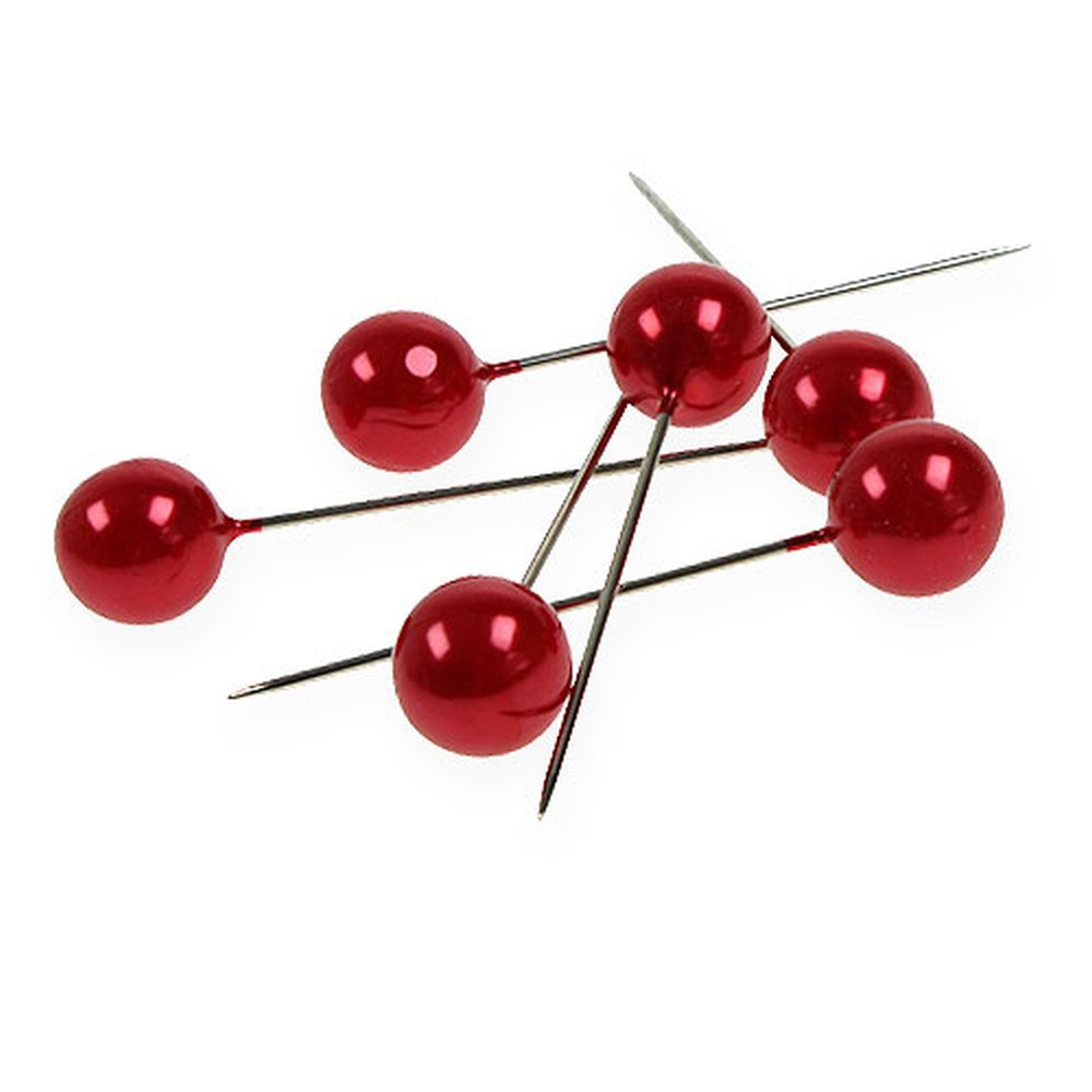 You get 6 of the red and silver pearl headed needles in a small box made of plastic. Each needle is around 90 millimeters long and each pearl has an approximate diameter of 20 millimeters.