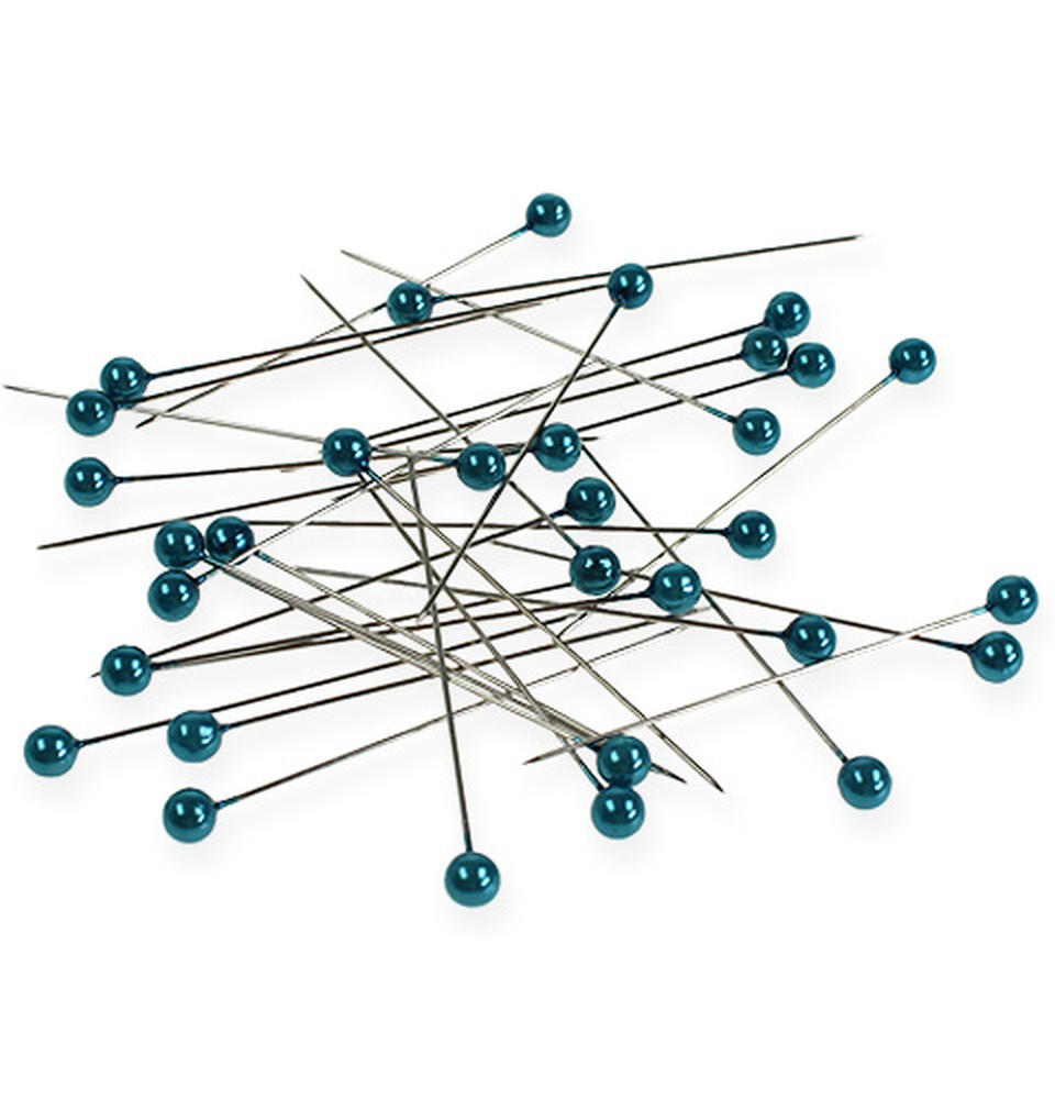The pearl-headed needles in turquoise are delivered in a practical hanging box with 100 copies each. A needle is about 65 millimeters long; the pearl has a diameter of about 6 millimeters.