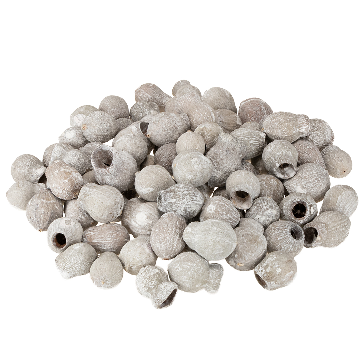 The extraordinary natural products are also known under the name bell fruit, as they are reminiscent of small bells with their balloon-shaped body at the bottom and narrower at the top. The heavily woody fruits were carefully prepared and hollowed out down to the core. The white wash gives them an elegant, wintery look, which makes them ideal components for graceful funeral floral arrangements.