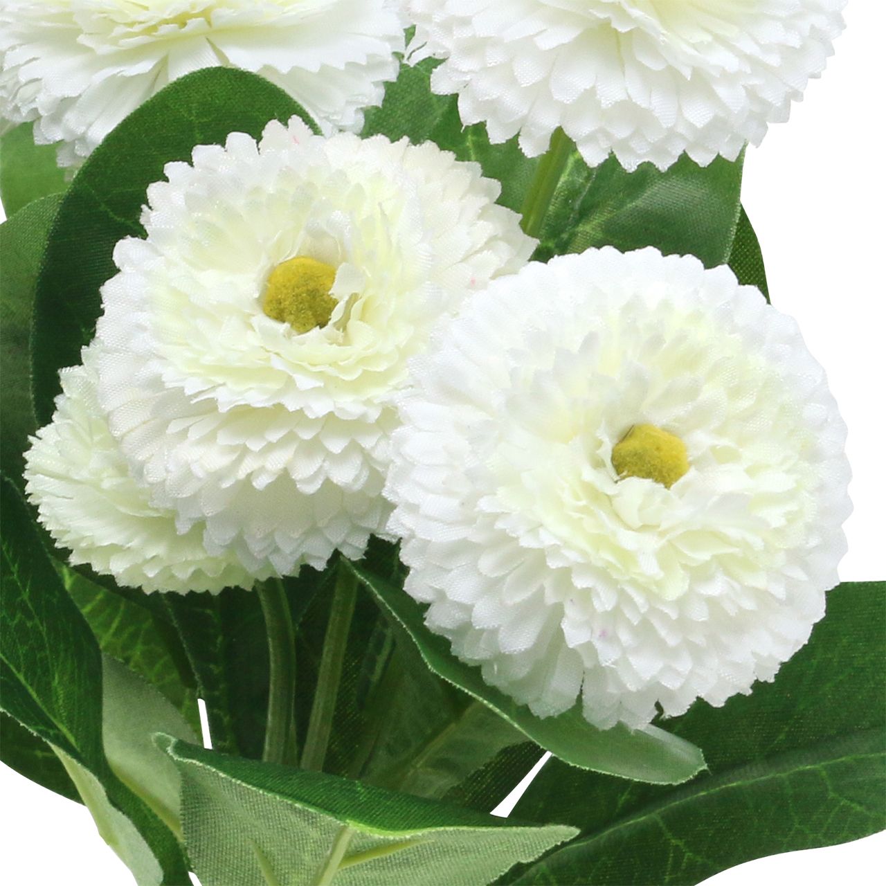 Take a look at these filigree and cheerful pompom flowers of this high-quality Bellis band! This spring-like artificial flower will perfectly enrich your this year's spring decoration and skillfully awaken spring fever in every viewer. No wonder, not least because it is generally considered to be a thousand and one. This artificial replica is in no way inferior to its natural model in terms of beauty. The bunch of silk flowers was made with great care and attention to detail. A bunch consists of 5 flexible stems, each with different sized flower heads in pure white.