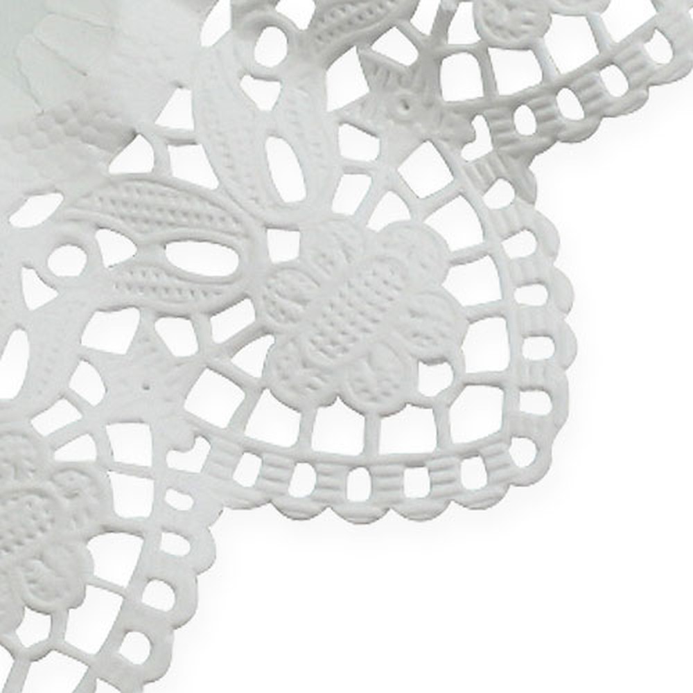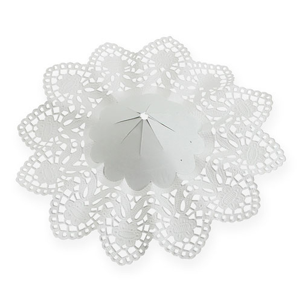 The large Biedermeier cuffs with an outside diameter of around 30 centimeters are offered in a set of 25 pieces. They are made of sturdy, white paper and have a filigree pattern. Each cuff has an inside diameter of approximately 14.5 centimeters.