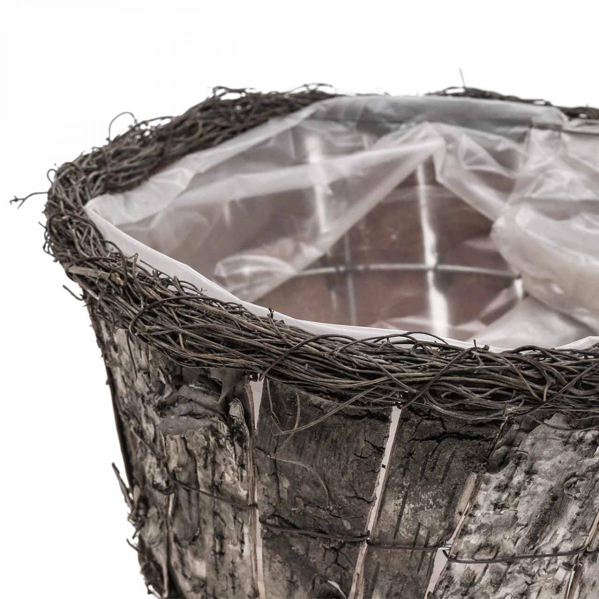 The planter consists of a metal basket, around which pieces of tree bark and braided vines are wound. The flower pot is lined with plastic film so that you can plant it straight away.