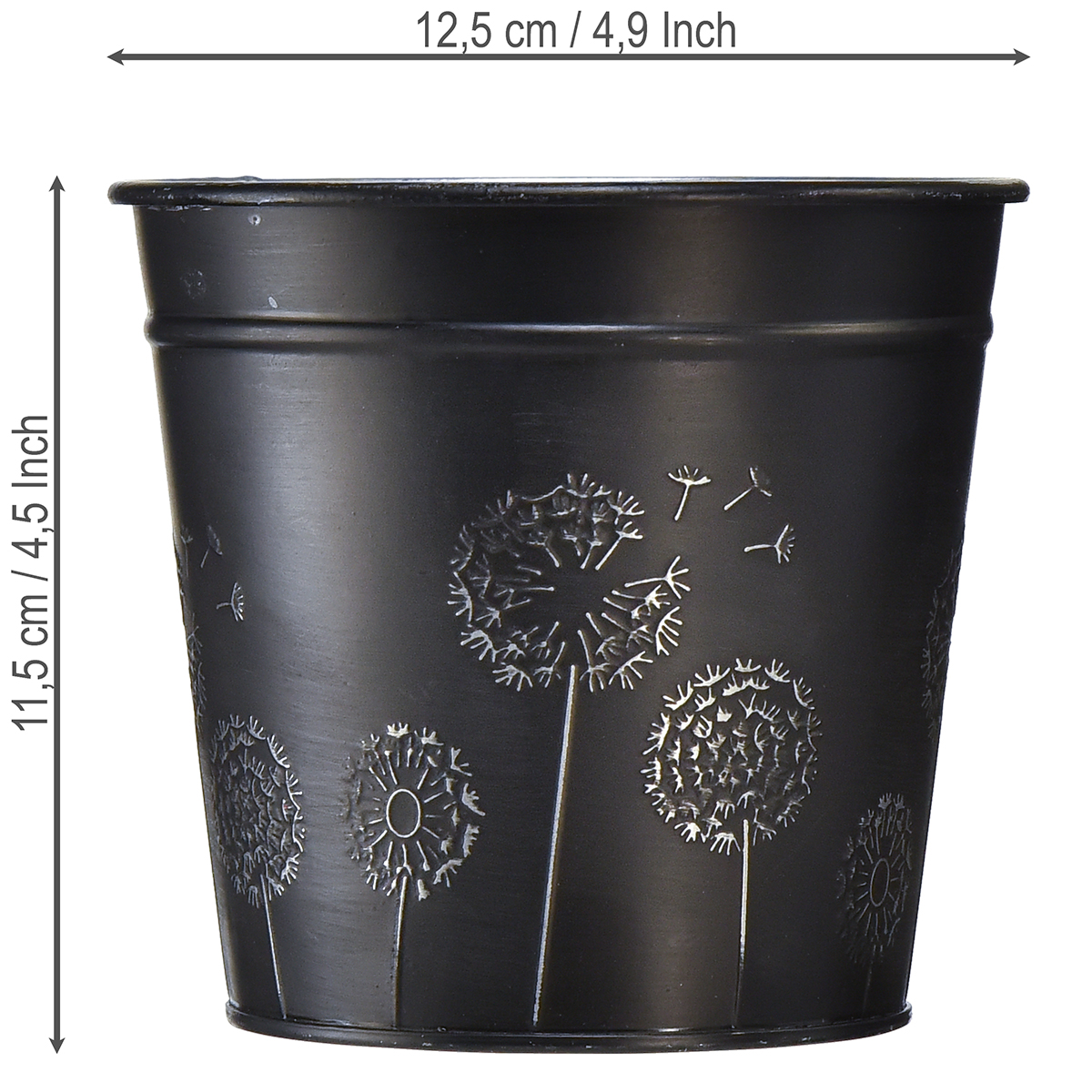 This black flower pot features a silver-colored decoration that makes you feel like summer. Dandelions come in different sizes and stages. And some umbrellas are already flying off to new destinations.
