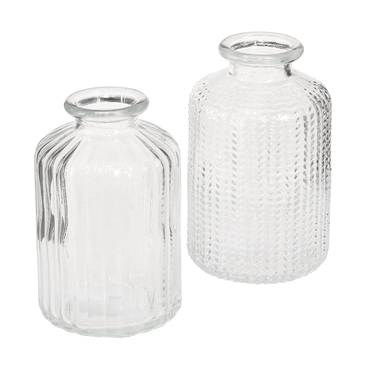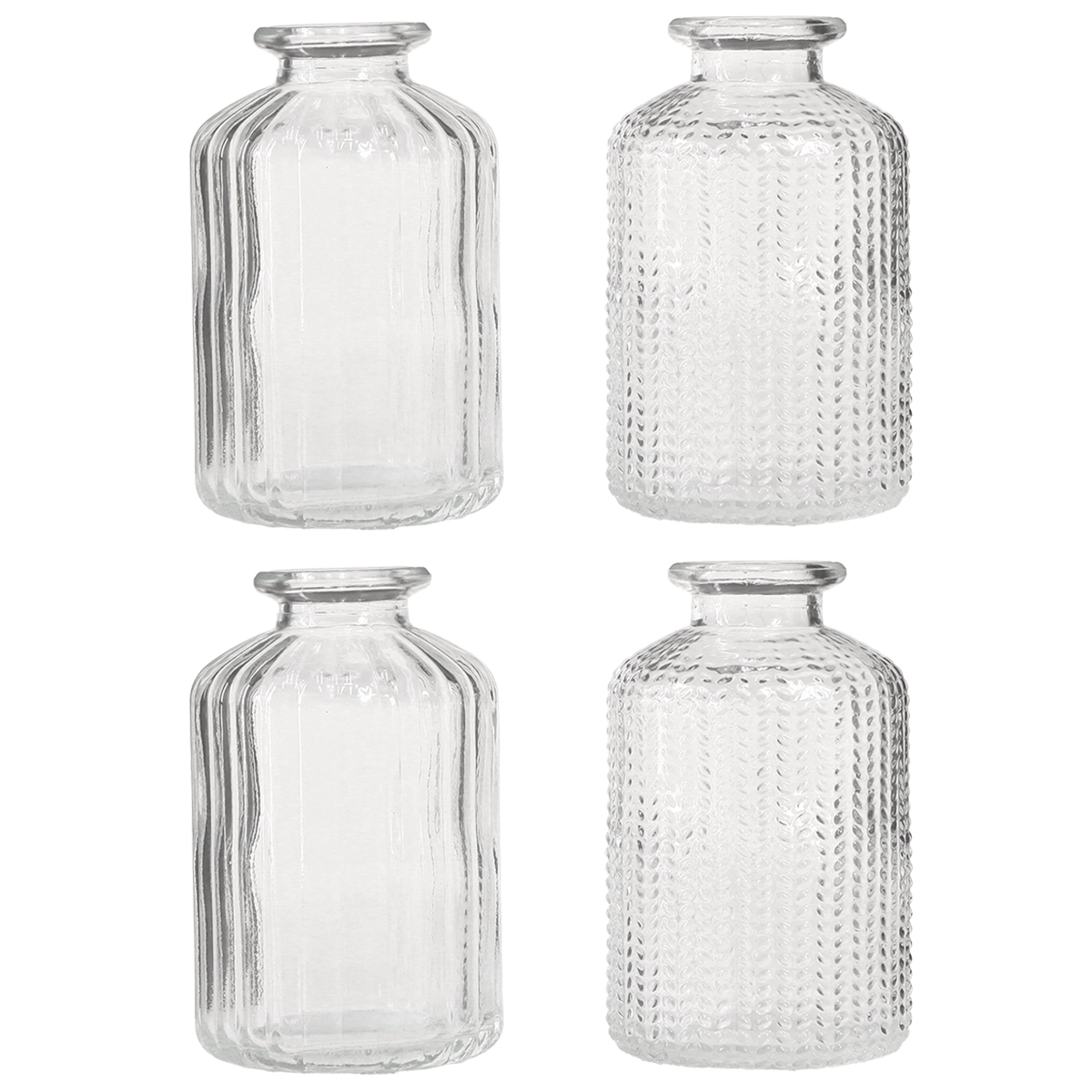 Each of the four decorative glass bottle vases is ideal as a stylish planter and charming retro mini vase. Designed in an elegant transparent look with an attractive scale or grooved decor, they fit seamlessly into any interior style. Whether boho, country house or shabby chic, these small glass vases set charming accents in your interior as vintage home accessories.