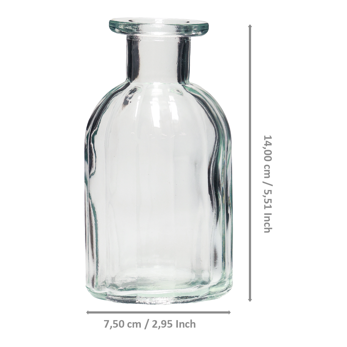 In our shop you can also find the bottle vase in a larger version. The small glass vase decoration is around 14 centimeters high and has a diameter of around 7.5 centimeters.