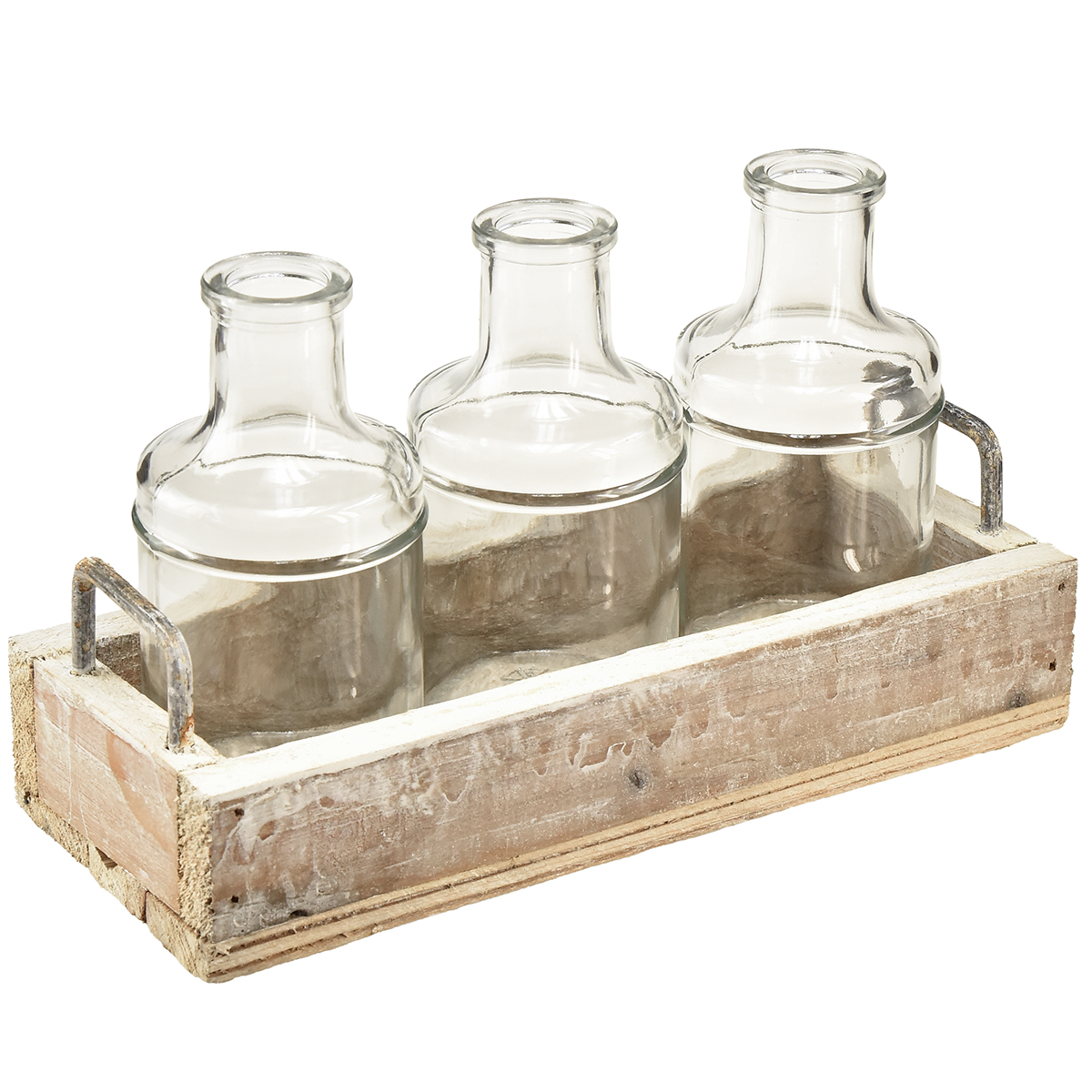 Product name: Bottles decoration glass with wooden tray vintage 24x9,5x14cm