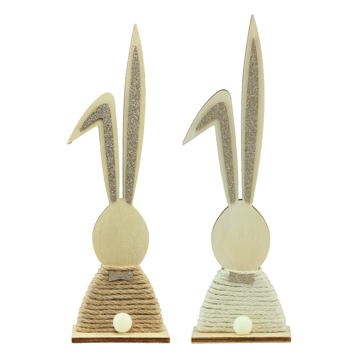 The rabbit figures consist of a silhouette carefully milled out of the wood. The body is wrapped with natural fiber, which gives the decorative bunnies their special boho chic. With a bow tie and glitter ears, the wooden Easter bunny looks very elegant. The fluffy tail rounds off the Easter figure in a cute way. Thanks to the wooden base, the stand stands reliably on the table or on the windowsill, or hide the base in a nest under the Easter grass!
