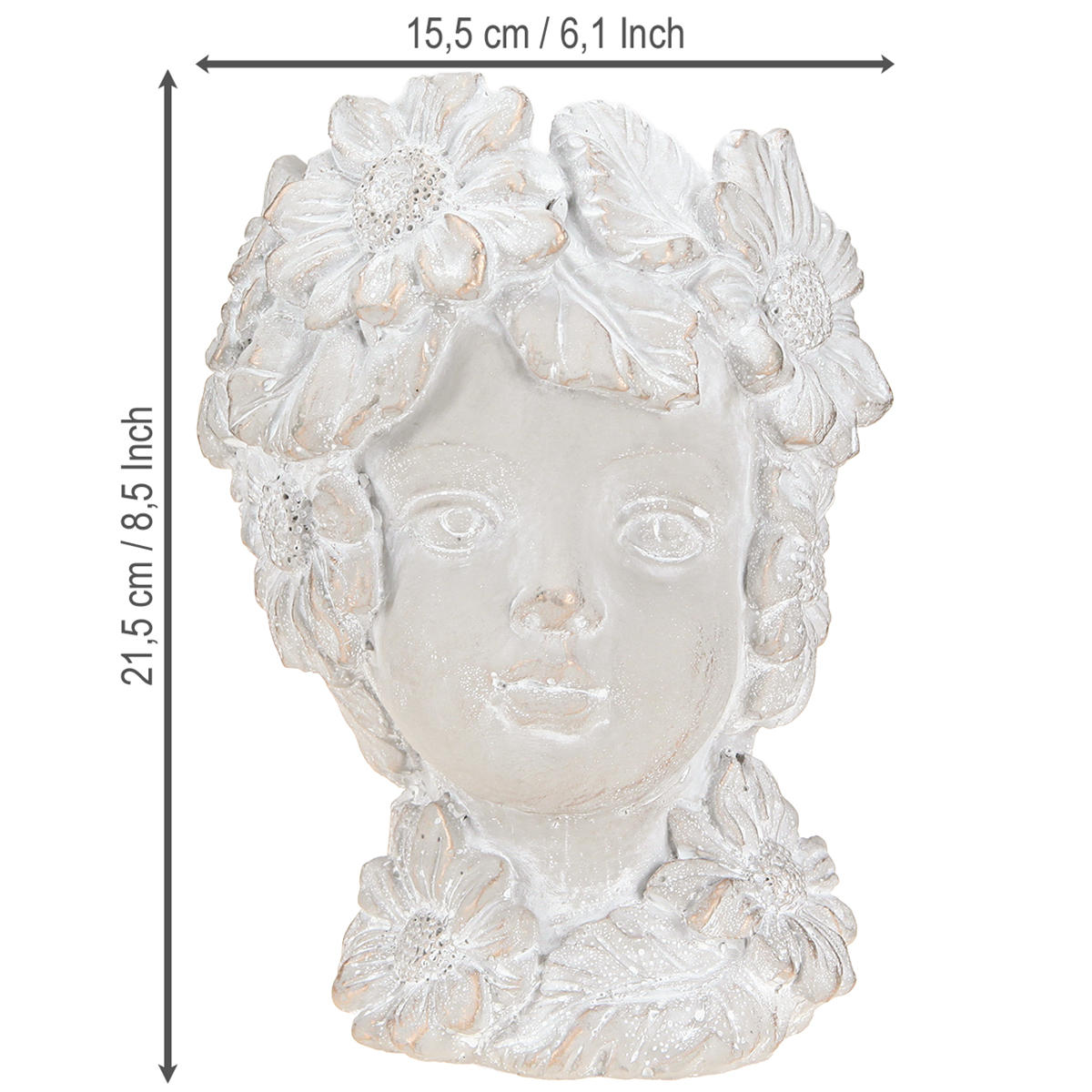This enchanting cast stone bust, which can be used as a planter or decorative vase, is a true highlight for lovers of antique decorations. Measuring approximately 15.5 cm x 15.5 cm x 21.5 cm, it is ideal for indoor and outdoor use. Its classic design with fine details such as the artfully crafted hair and folds in the robe adds a touch of elegance to any room. The gray figure is partially whitewashed and refined with gold accents, giving it a refined appearance. The robust cast stone material ensures the bust stands securely and brings a piece of history into your home. This decorative bust is not only an eye-catcher but also a functional planter for herbs and flowers, thus enhancing special arrangements. The sculpture's floral headdress adds a romantic touch, perfect for an eccentric or classic decorative setting.