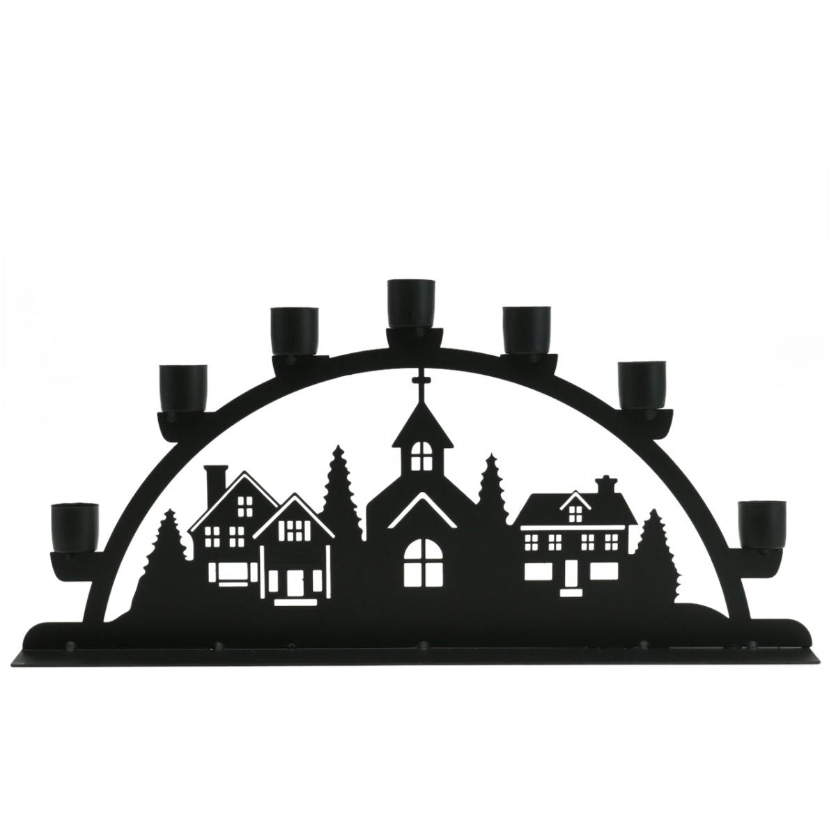The popular Christmas decoration shows the silhouette of scenic representations, which are particularly impressive with the light of the candles. This metal candle arch with a modern design is painted black and shows a scenery of houses and trees surrounding a Christian church building. The finely worked recesses on the metal show fine details such as windows, doors and roofs. The village comes alive as the candles flicker.