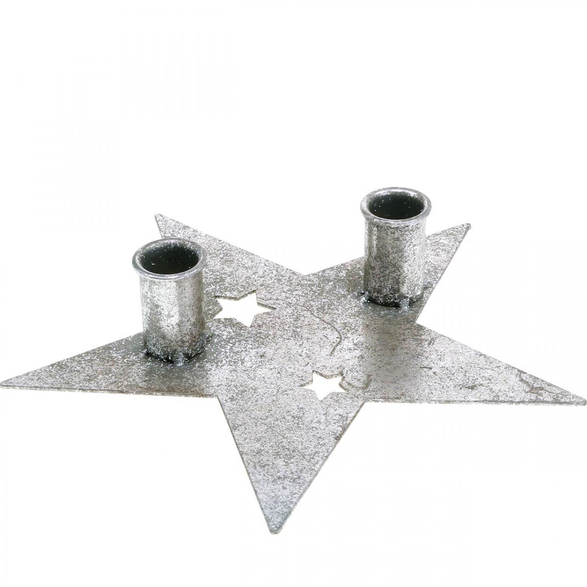Product name: Candle decoration star, metal decoration, candle holder for 2 taper candles silver, antique look 23cm × 22cm