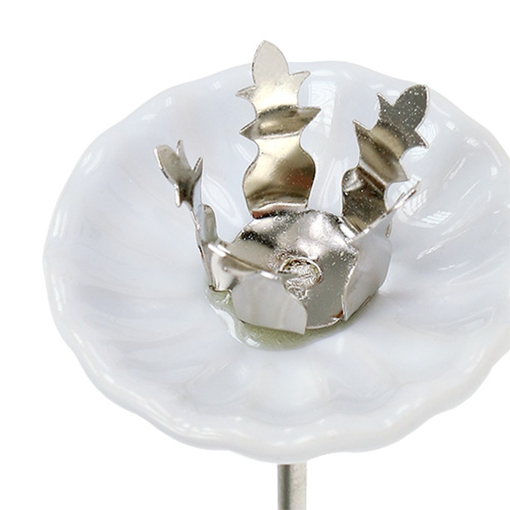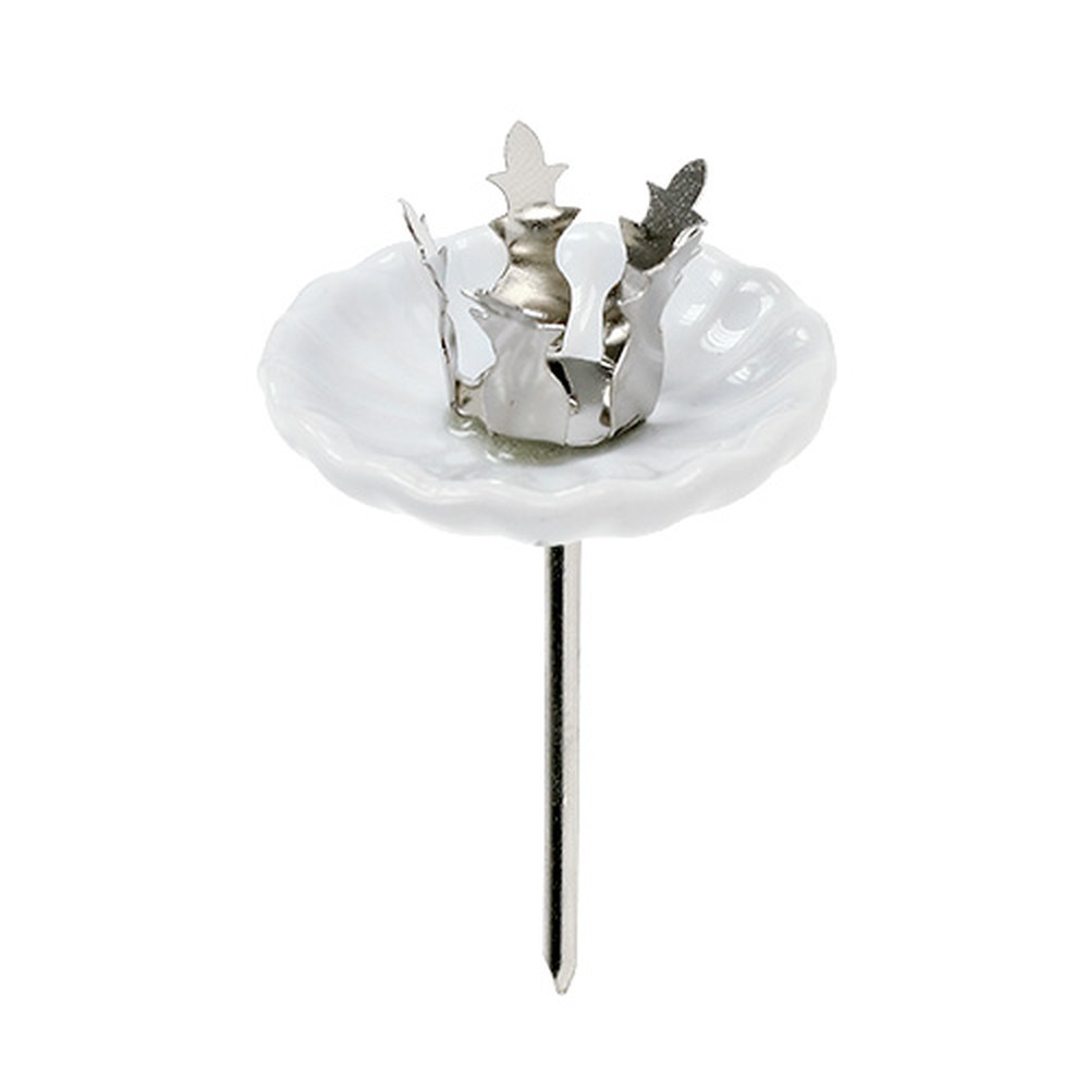 The candle holder for tree candles in silver and white comes in a set of 4 and has a total height of approx. 7cm. The crowns each have a diameter of approx. 4 cm and are approx. 2 cm high. The tips of the crowns are slightly curved outwards and elegantly jagged.