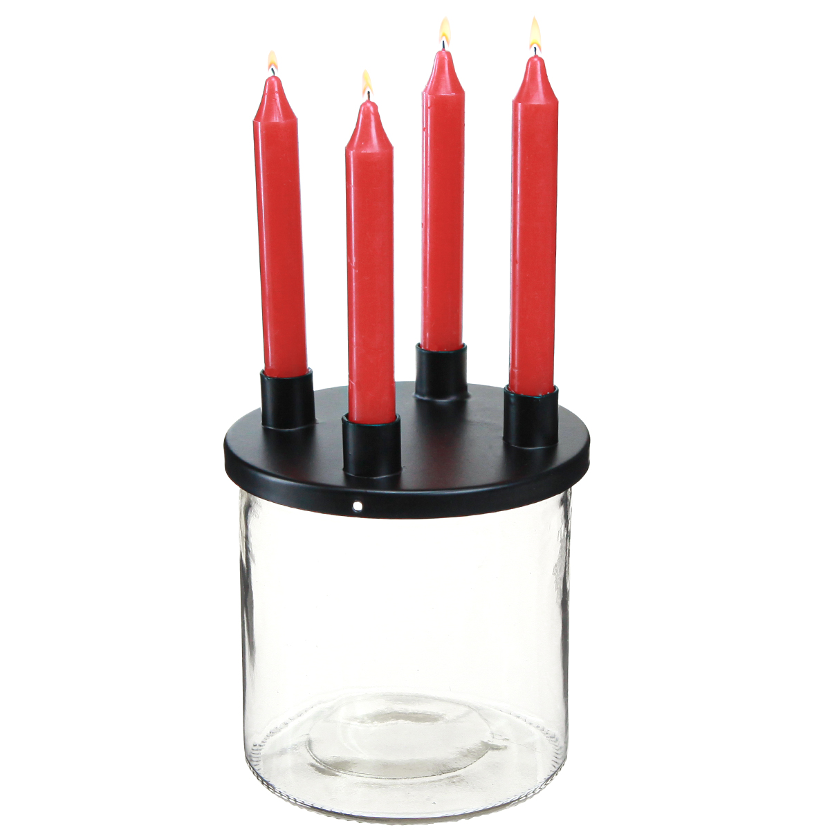 In the metal lid there are four holders for small candles or pyramid candles with a diameter of about 1.3 centimeters. While the upper part serves as a candle holder, the decorative glass can be filled with decorative elements and decorated in many ways.
