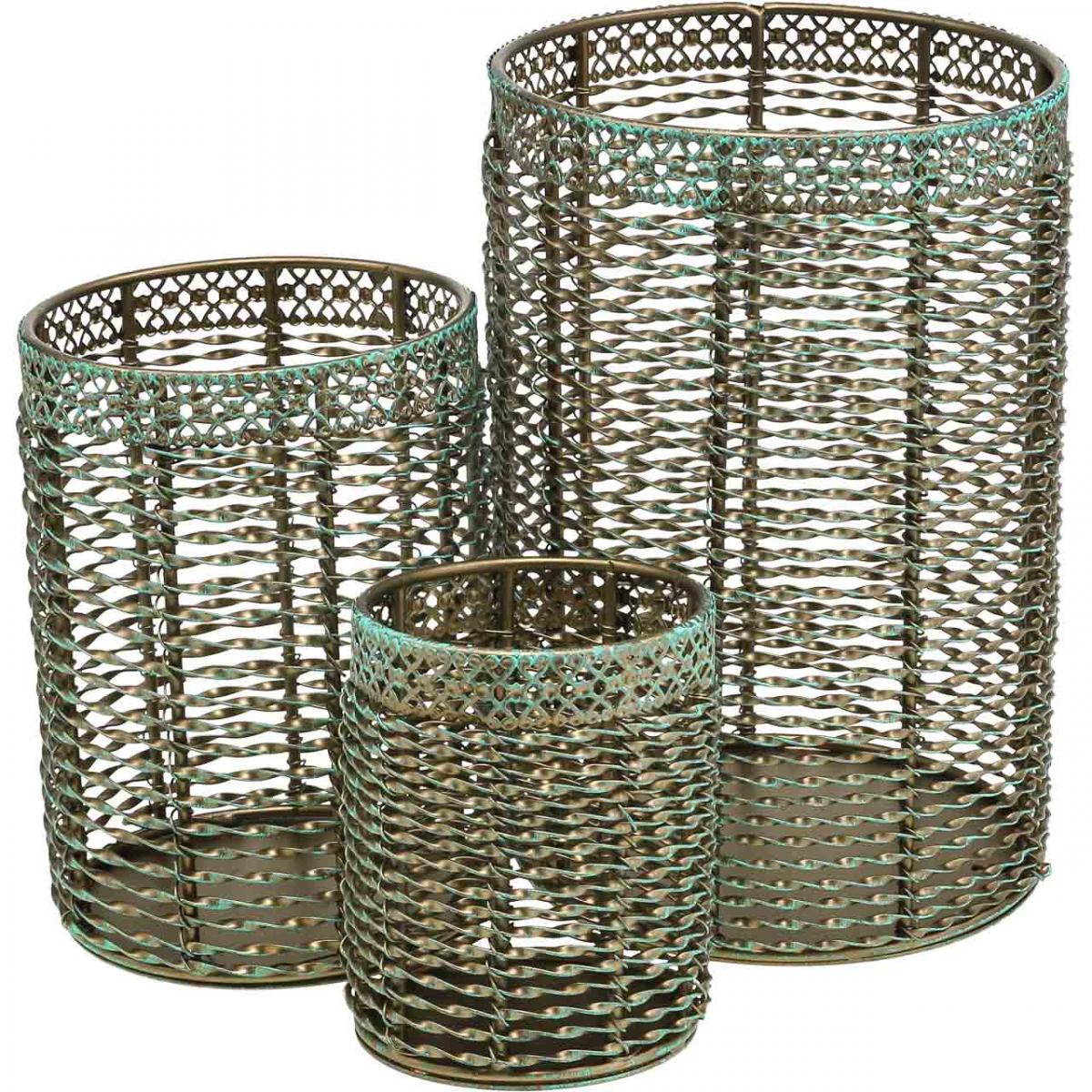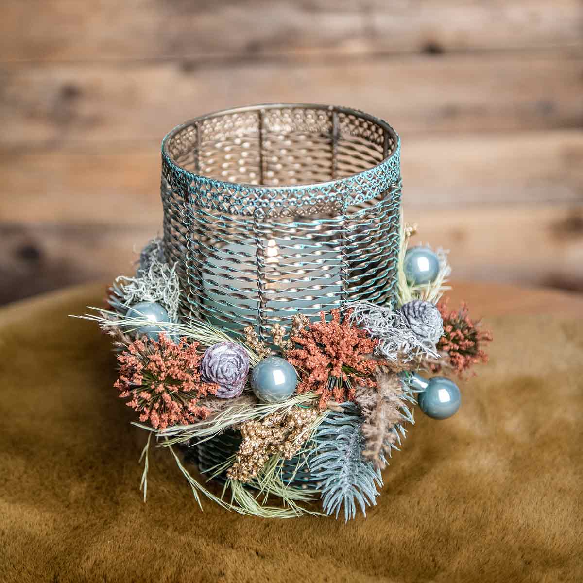 The metal strips are twisted into each other and artfully designed to form the cylindrical shape of the candle holder. The upper metal edge consists of particularly ornate ornaments. The basic color of the candle holder is a noble golden brown that is covered with light turquoise brushstrokes and thus creates an artificial copper patina.