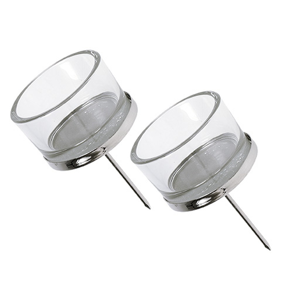 The candle holder in silver with glass is offered as a set of 4 pieces. Each candle socket has a height of about 8.5 centimeters, of which the plug spike takes up about 5 centimeters. The inside diameter of the glass is approximately 4.5 centimeters and the outside diameter is approximately 5.2 centimeters.