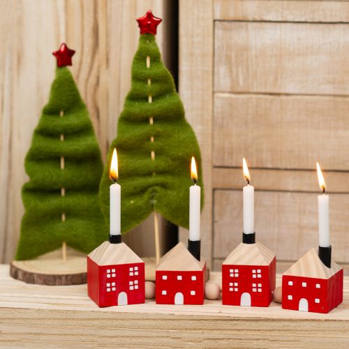 Candle holder on wooden decoration: four cute wooden houses in red and white