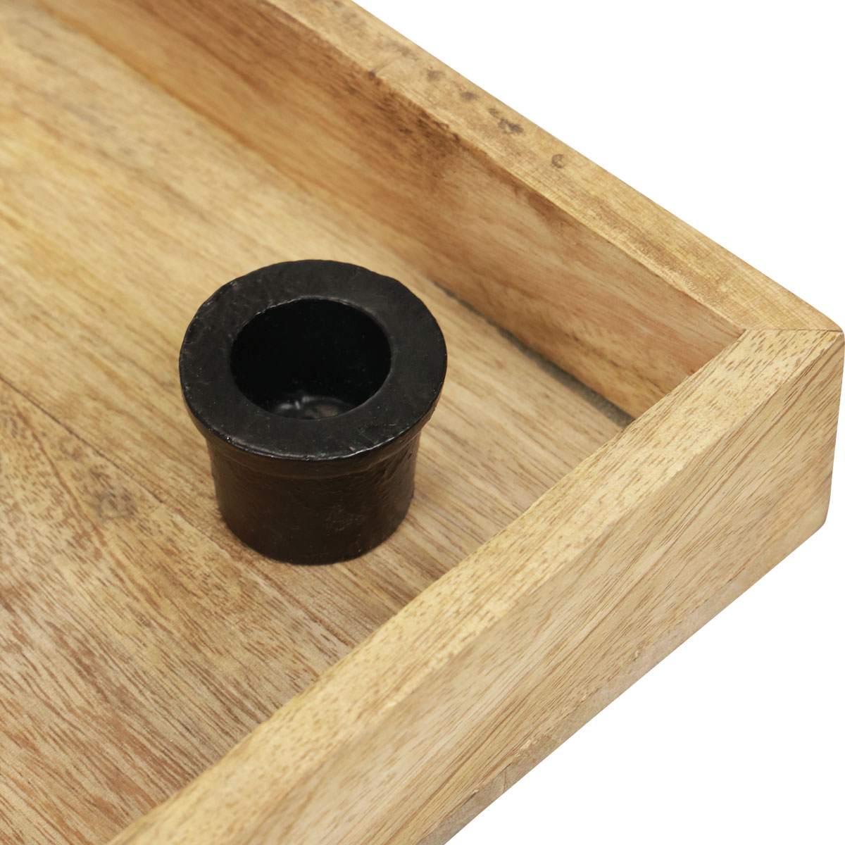The four metal candle holders are colored black and have a wide edge. The candle holders were firmly inserted into the wood using a pin and then fixed with glue. This means that the candle holders stand securely on the candle tray.