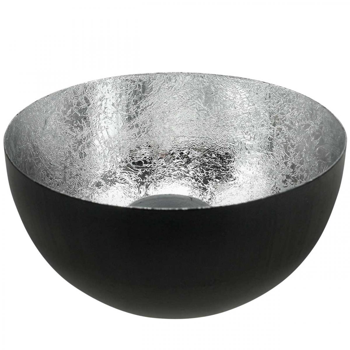 The timelessly elegant black and silver candle holder is designed like a simple bowl. The black outside is complemented by the silver-colored inside, which is rich in contrast. This coating is made even more exciting with finely embossed ramifications resembling lightning bolts or plant shapes.