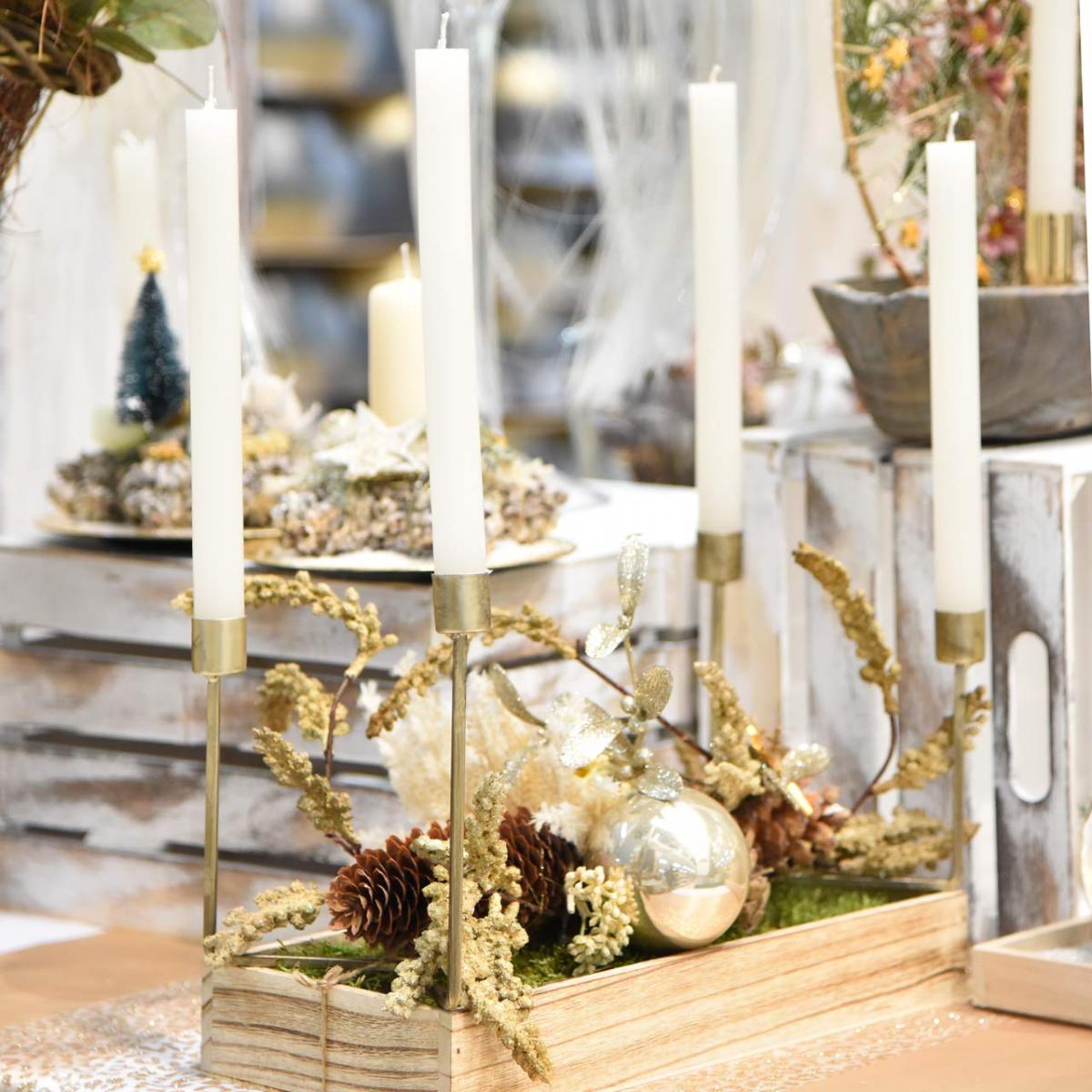 The Advent candle holder in a light, matt gold tone can be easily placed on a rectangular tray. Place a flower arrangement, moss, decorative sand or cones and nuts on the structure of the candlestick. The individual candlesticks seem to grow out of your decoration. Please note that the base should be insensitive and non-flammable, the hot wax can drip down. If you want to be on the safe side, you can put LED real wax candles on the candlestick for the candle tray.