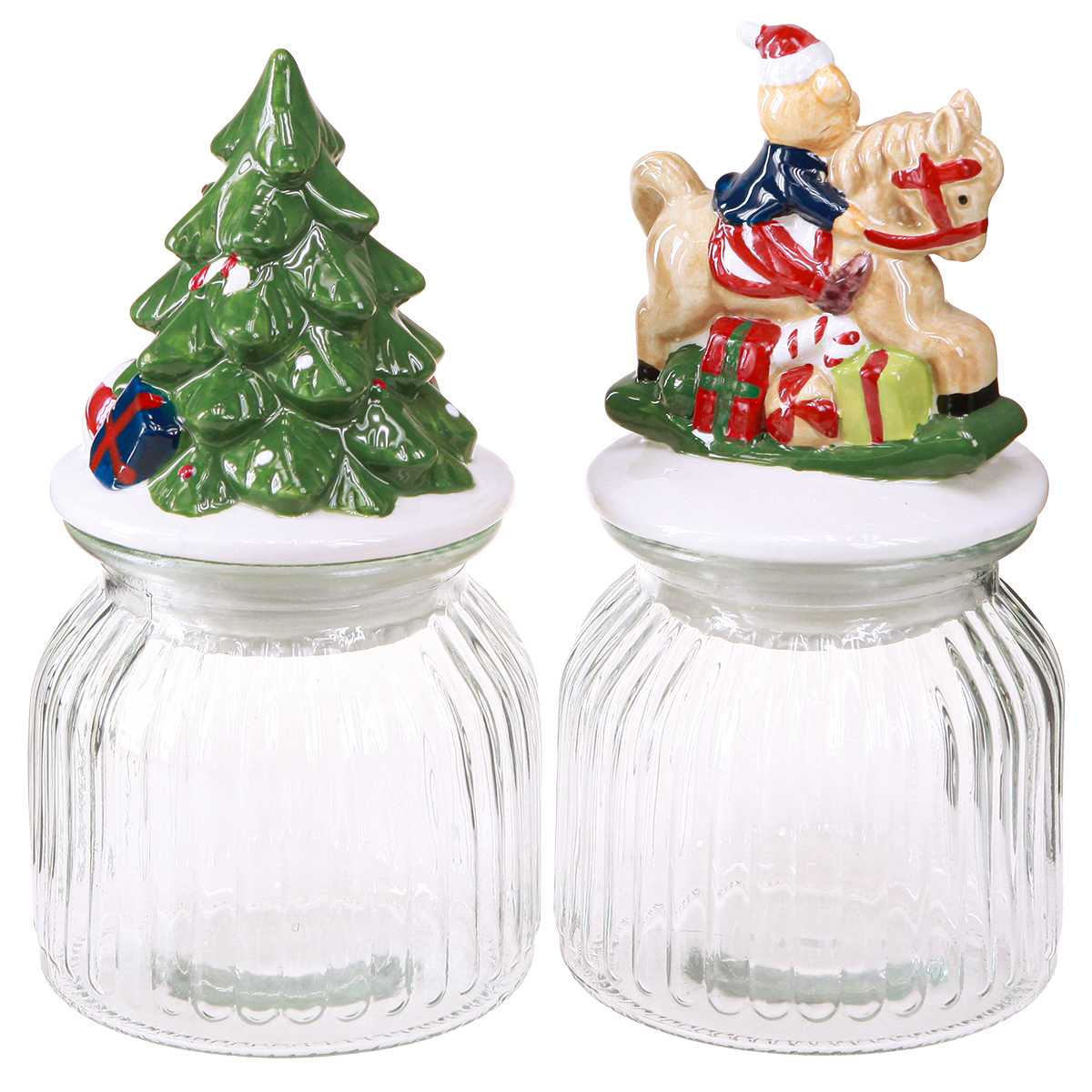 Experience the magic of Christmas with the exclusive candy jar set with lid that will make your table decoration a real highlight. The set consists of two assorted jars, each about 20 cm high. These candy jars are not only functional, but also a real eye-catcher on your Christmas table. The hand-painted ceramic lids, one with a cute teddy on a horse and the other with a magnificent Christmas tree and presents, give your home a touch of nostalgic charm. Thanks to the plastic seal, sweets and cookies stay fresh and can be presented in style. These Christmas candy containers are a must-have for every decoration lover who wants to add a personal touch to their table decoration. The candy jars combine practical storage with stylish aesthetics, ideal for chocolates, candies or cookies.