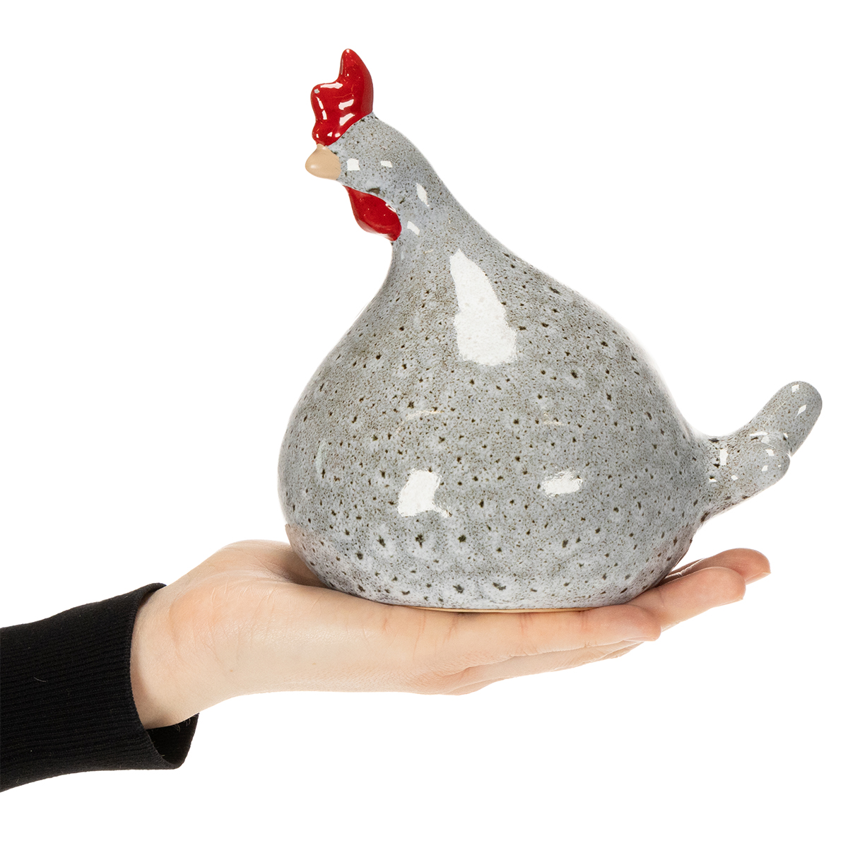 These ceramic chicken figurines, measuring 16 cm high and 13 cm wide, are perfectly proportioned to grace tables, shelves, or sideboards. Their charming shape, combined with the blue-speckled finish, lends the chickens a playful elegance. Those with an eye for detail will appreciate the distinctive beak and tiny eyes – a successful blend of modernity and a touch of rustic charm.