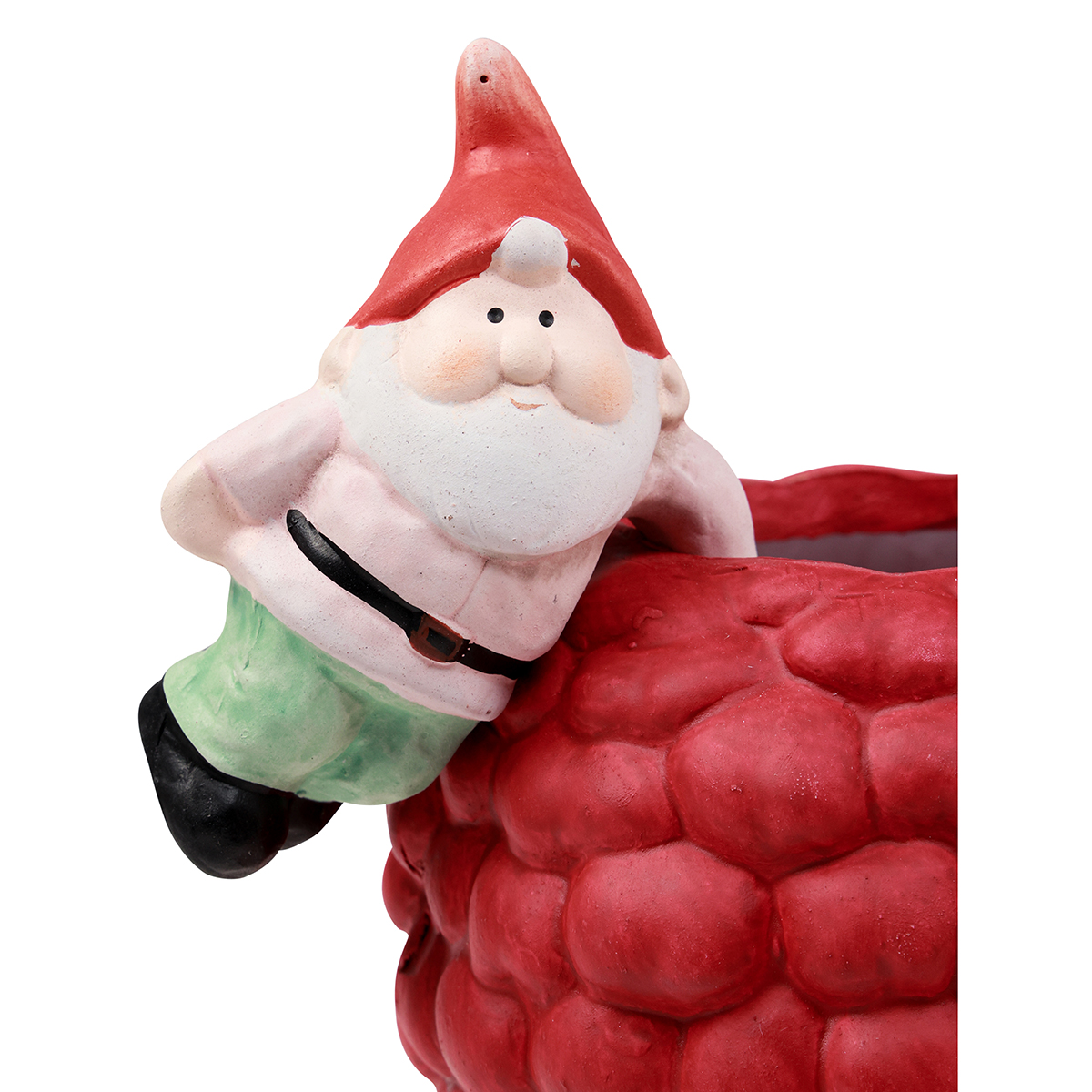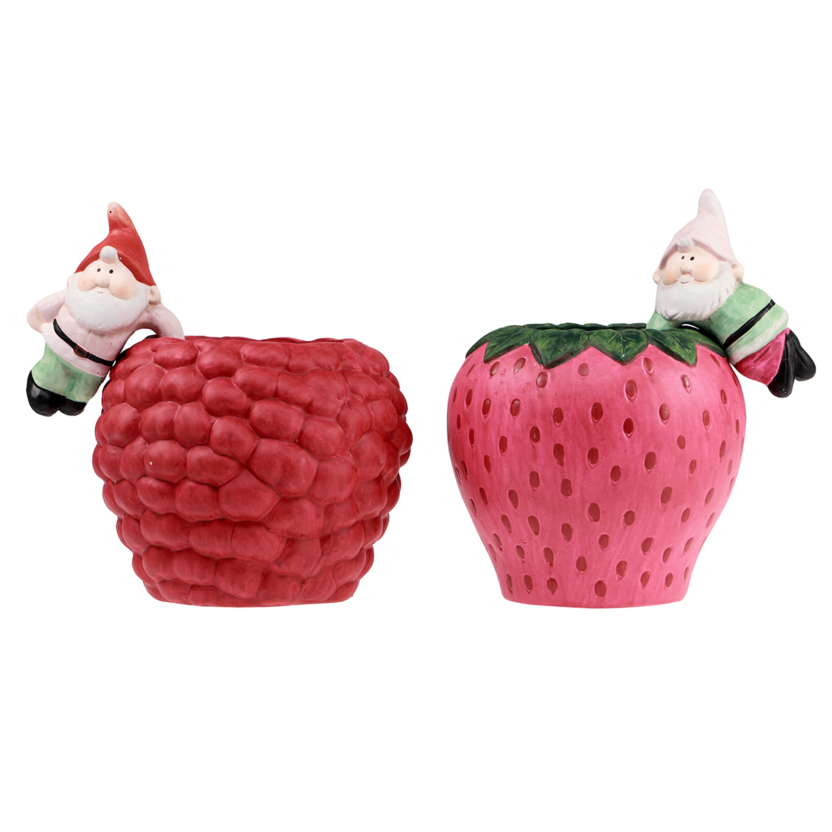 The strawberry and raspberry ceramic pots are bulbous like the original fruits. The planters therefore become wider in diameter from the bottom towards the opening. On the strawberry you will also find the base of the green leaves at the opening.