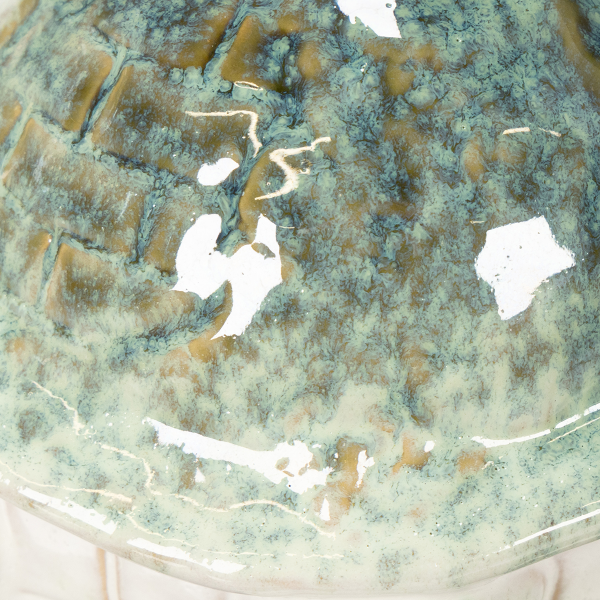 This lovingly crafted ceramic turtle not only brings a fresh touch to your home, but also impresses with its high-quality workmanship and unique appearance. The shell gleams in a soft green with a natural gradient, while the body is an elegant cream. The aesthetic details lend a fresh, harmonious touch to any setting. The figure is ideal for decorating a living room shelf or garden table. It also looks simply enchanting on a balcony or combined with plant arrangements in an entryway. Thanks to its timeless design, it complements nautical, modern, or rustic styles perfectly. The ceramic turtle is not frost-resistant, but it is perfect for use in a conservatory or indoors. Showcase the turtle with color-coordinated pots, vases, or other decorative figures – you'll be delighted with the result!