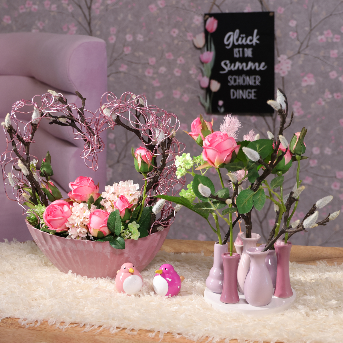 Looking for a special touch for your home? Something that adds freshness, elegance, and a hint of modernity? This pastel-colored vase set made of high-quality ceramic could be just what you're looking for. The six artfully shaped vases, combined with a sturdy white ceramic base, guarantee versatile uses – from table decorations to eye-catching shelf accents. Whether filled with fresh flowers, small bouquets of dried flowers, or simply displayed individually as stylish decorations, these small vases always add the perfect touch. The harmonious color palette of pink and purple creates a calming yet inviting atmosphere. A perfect choice for anyone who appreciates style and functionality and wants to give their living space a modern look.
