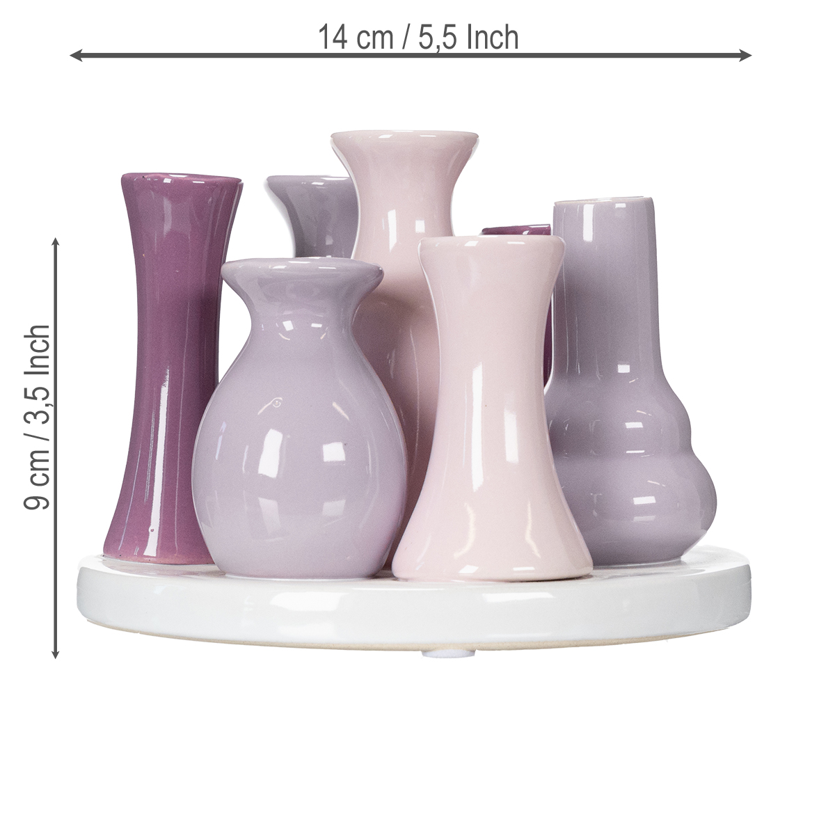 Looking for a special touch for your home? Something that adds freshness, elegance, and a hint of modernity? This pastel-colored vase set made of high-quality ceramic could be just what you're looking for. The six artfully shaped vases, combined with a sturdy white ceramic base, guarantee versatile uses – from table decorations to eye-catching shelf accents. Whether filled with fresh flowers, small bouquets of dried flowers, or simply displayed individually as stylish decorations, these small vases always add the perfect touch. The harmonious color palette of pink and purple creates a calming yet inviting atmosphere. A perfect choice for anyone who appreciates style and functionality and wants to give their living space a modern look.