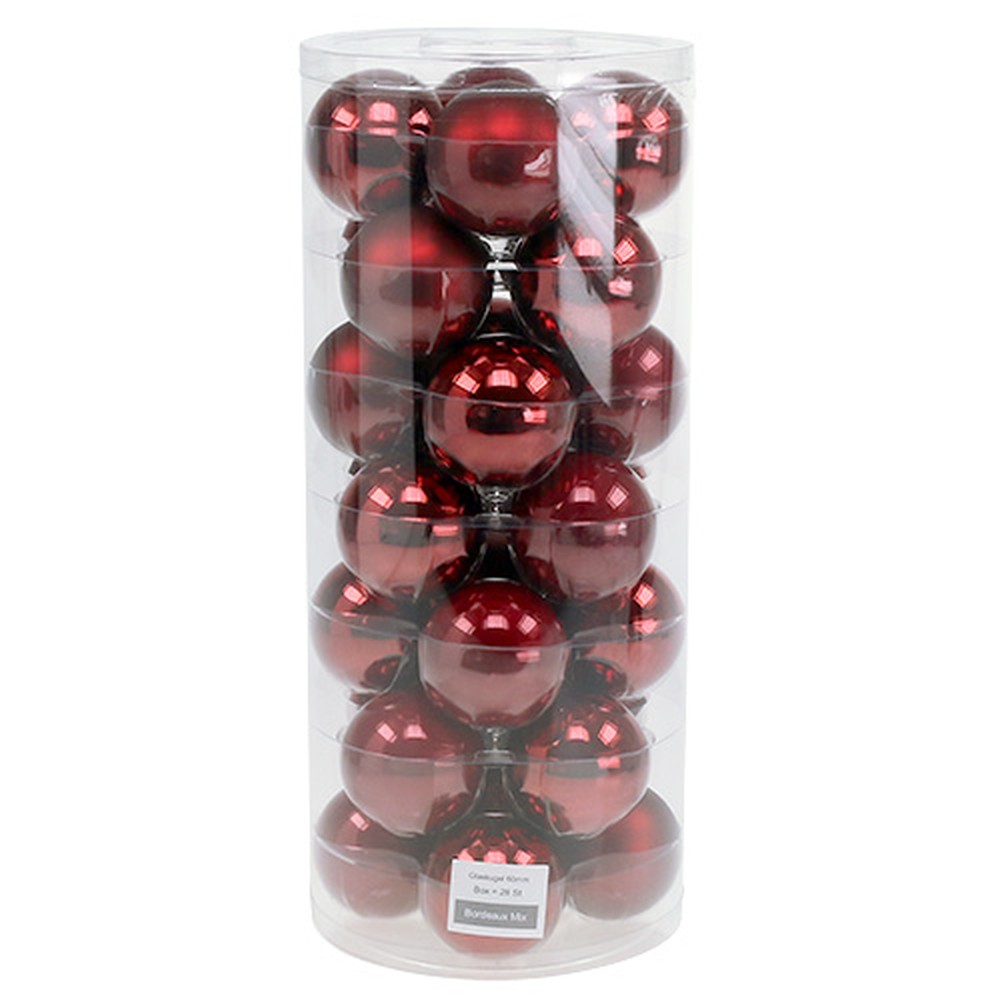 The Christmas bauble made of glass in Bordeaux is delivered in a box with a total of 24 pieces. With the metal eyelet, each glass ball is approximately 7 centimeters long and approximately 6 centimeters in diameter.