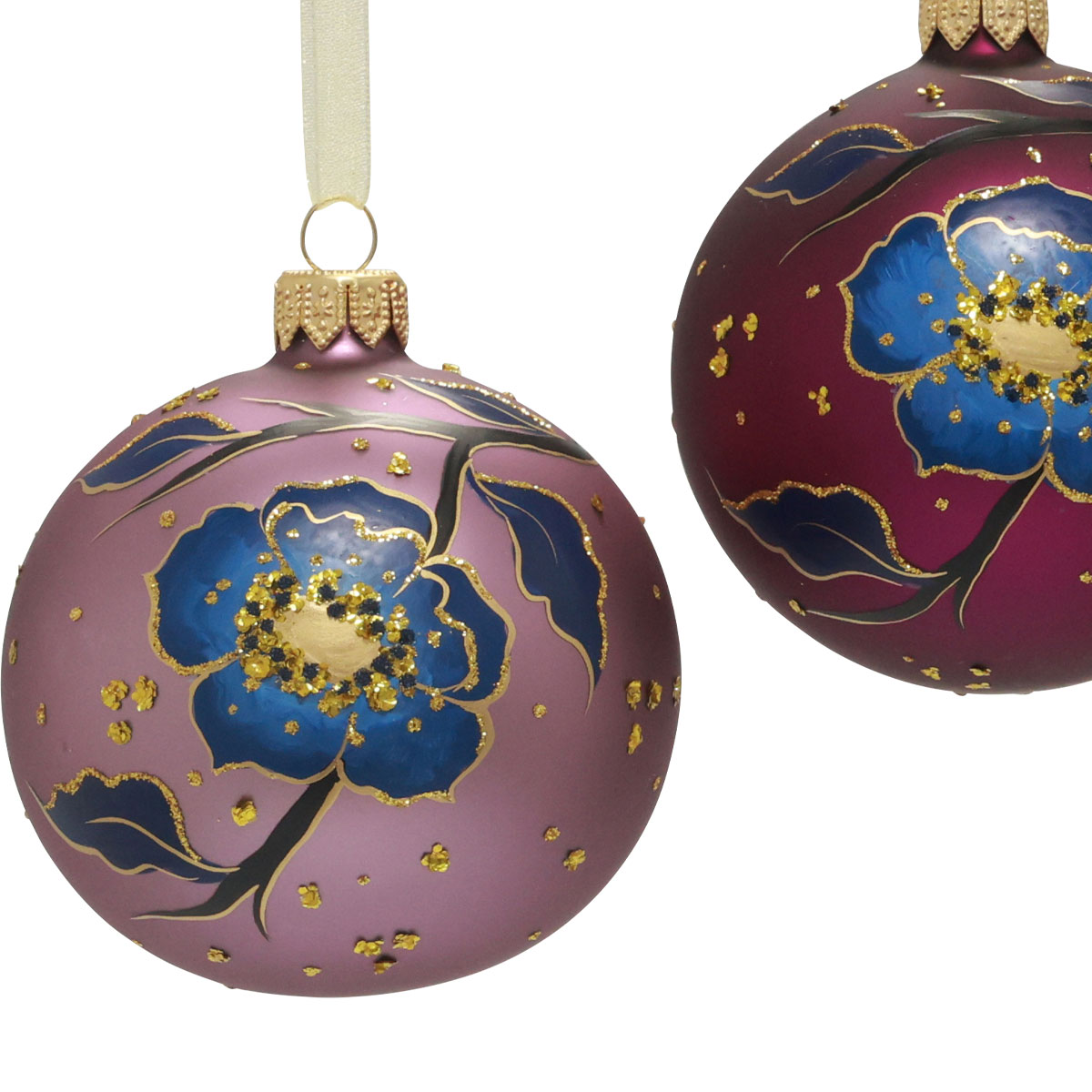 While the flower shines in blue on the purple background, the flower edges sparkle with golden glitter. This glitter runs sporadically over the entire glass Christmas ball and artfully frames the flower motif. A flower stalk shows up towards the golden cap, so that the individual blossom seems to be protected from above and below by foliage and stalk, like a tendril.
