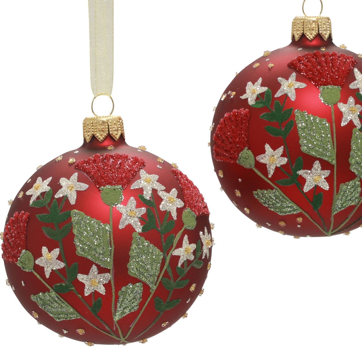 The meadow motif on the red glass balls is wonderfully harmonious. It glitters in white, red and green. Flowers with star-shaped blossoms are reminiscent of edelweiss. They dominate the picture, while the fan flowers in glittering red and the imaginatively designed leaves line up artfully with the edelweiss motif.