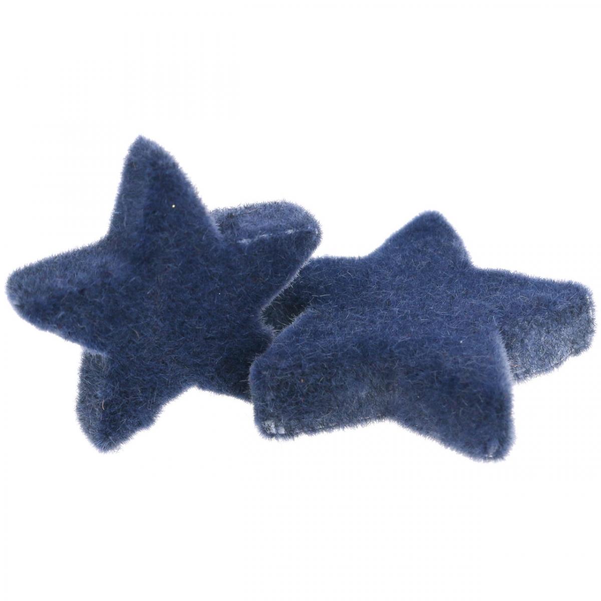 The flocked star decoration for Christmas in blue comes with about 40 scatter pieces in two sizes in a plastic bag. Each scatter decoration star has an approximate diameter of about 4 or 5 centimeters.