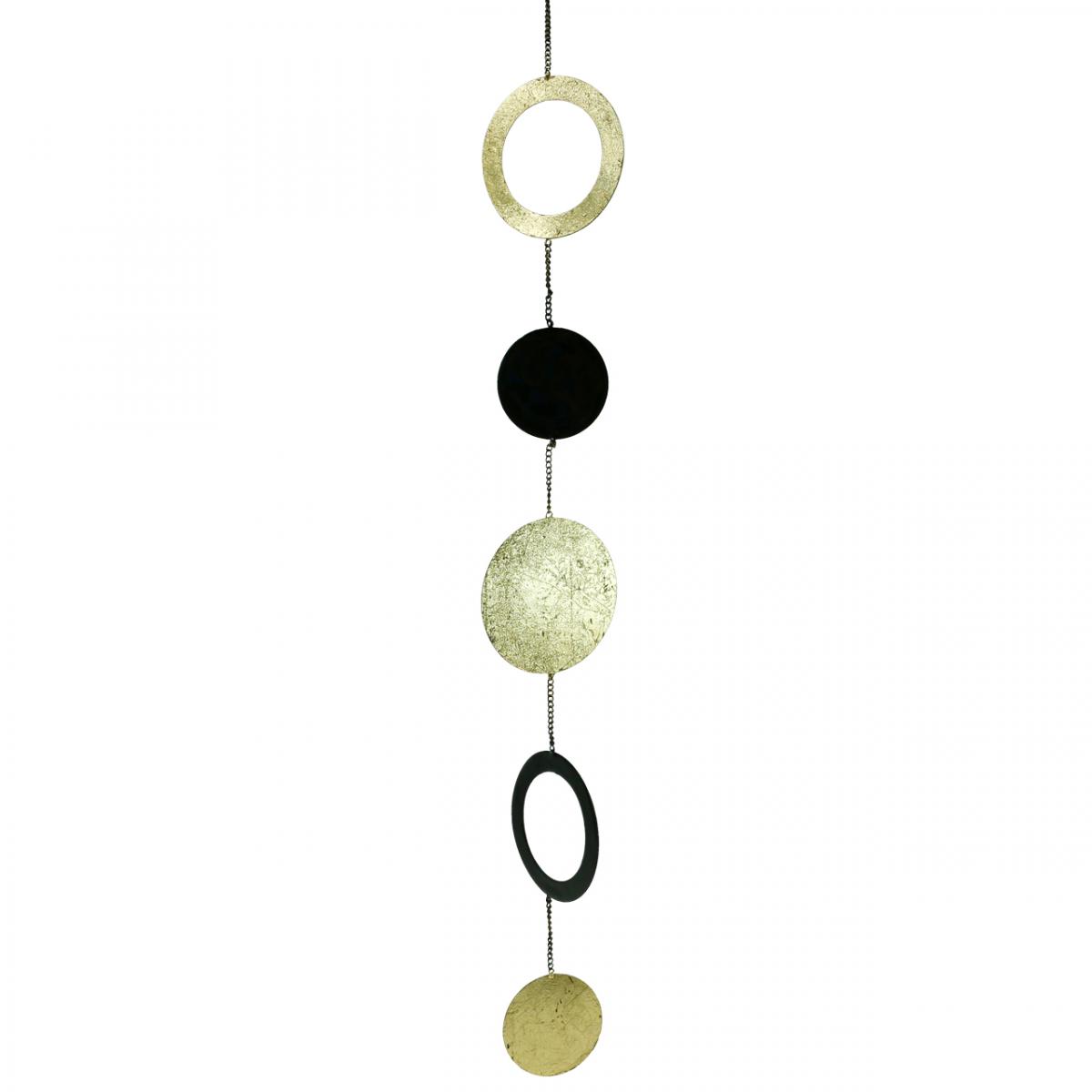 A total of five round elements in different sizes and in the form of circles or rings alternate with this Christmas decoration in black and gold. The circular shapes of the hanging decoration are connected to each other with narrow metal chains and have a small ring at the top for hanging.