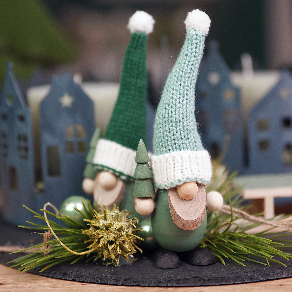 Welcome to the magical world of Christmas gnomes! With the wooden gnome in green and mint, you can bring lovely charm into your own home or create unique, fairytale Christmas decorations. The cute wooden gnome figures with their knitted pointed hats are perfect for creating a cozy Christmas atmosphere.